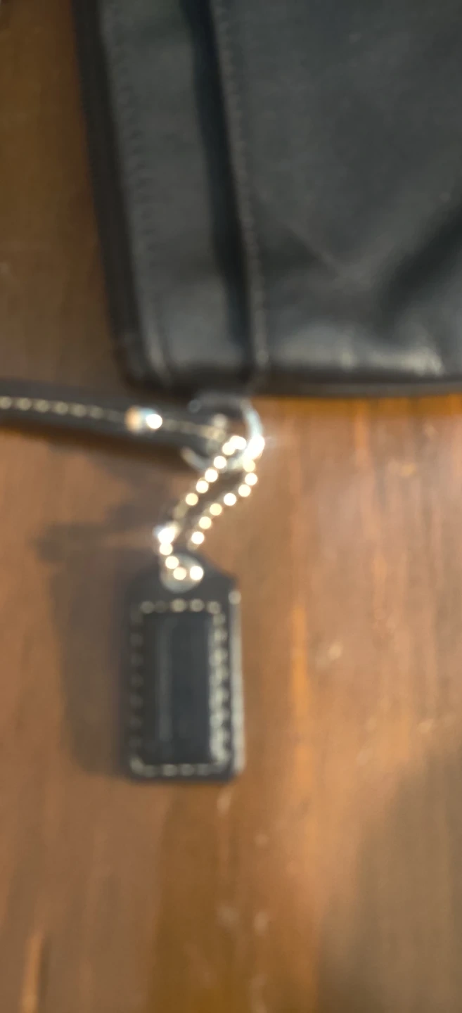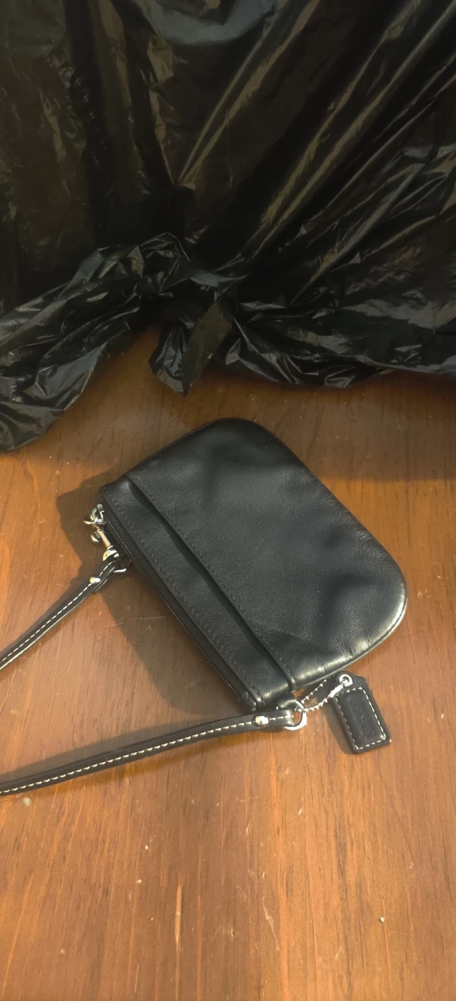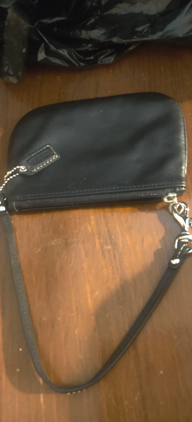 Coach wristlet pouch made of black leather. It has a zippered closure and a detachable wrist strap. The interior is lined in a light blue fabric.Will not fit your cellphone and does not have tje coach logo inside