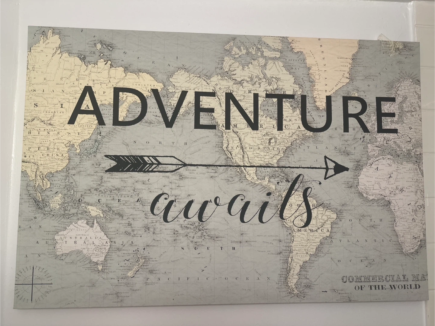 Add a touch of wanderlust to your home with this world map wall art! The print features the phrase "Adventure Awaits" and a vintage-style map. Perfect for adding a unique touch to any room