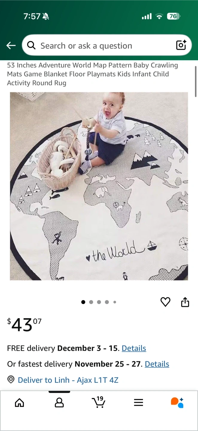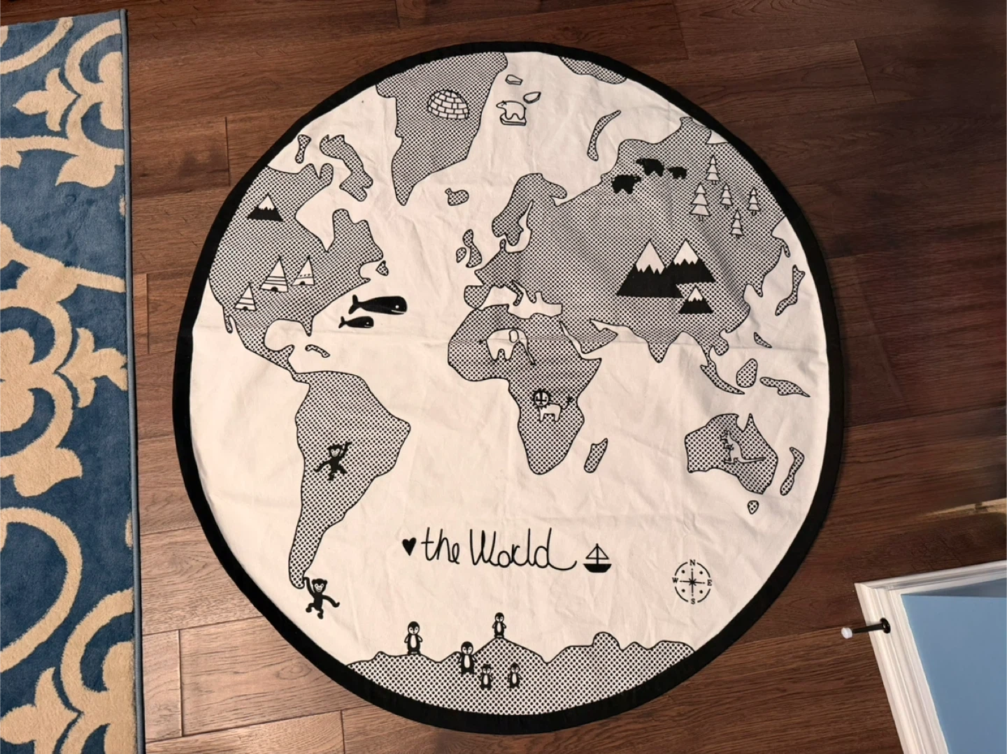 120Adventure World Map Baby Crawling Mat Selling a 53-inch adventure world map pattern baby crawling mat! It's a great floor playmat for kids and infants. The activity round rug is in great condition and ready for a new home. The canvas material is sturdy and machine washable. Retails for ~$45 Clean, smoke free home Pick up in North Ajax