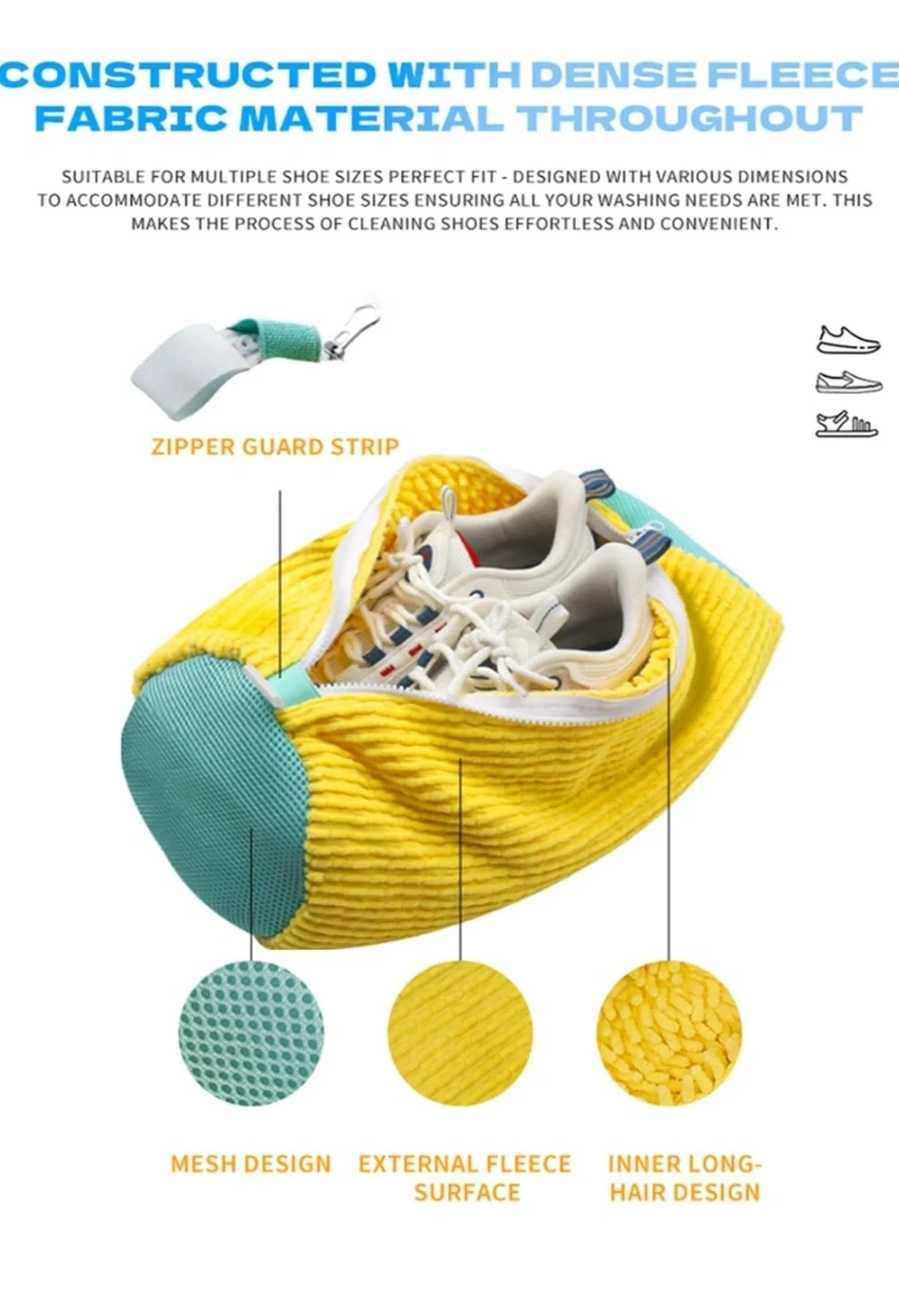 This shoe washing bag is constructed with dense fleece fabric. It features a mesh design, external fleece surface, and inner long-hair design. Elastic fastening straps prevent internal items from dislodging. It's suitable for multiple shoe sizes to accommodate washing needs!