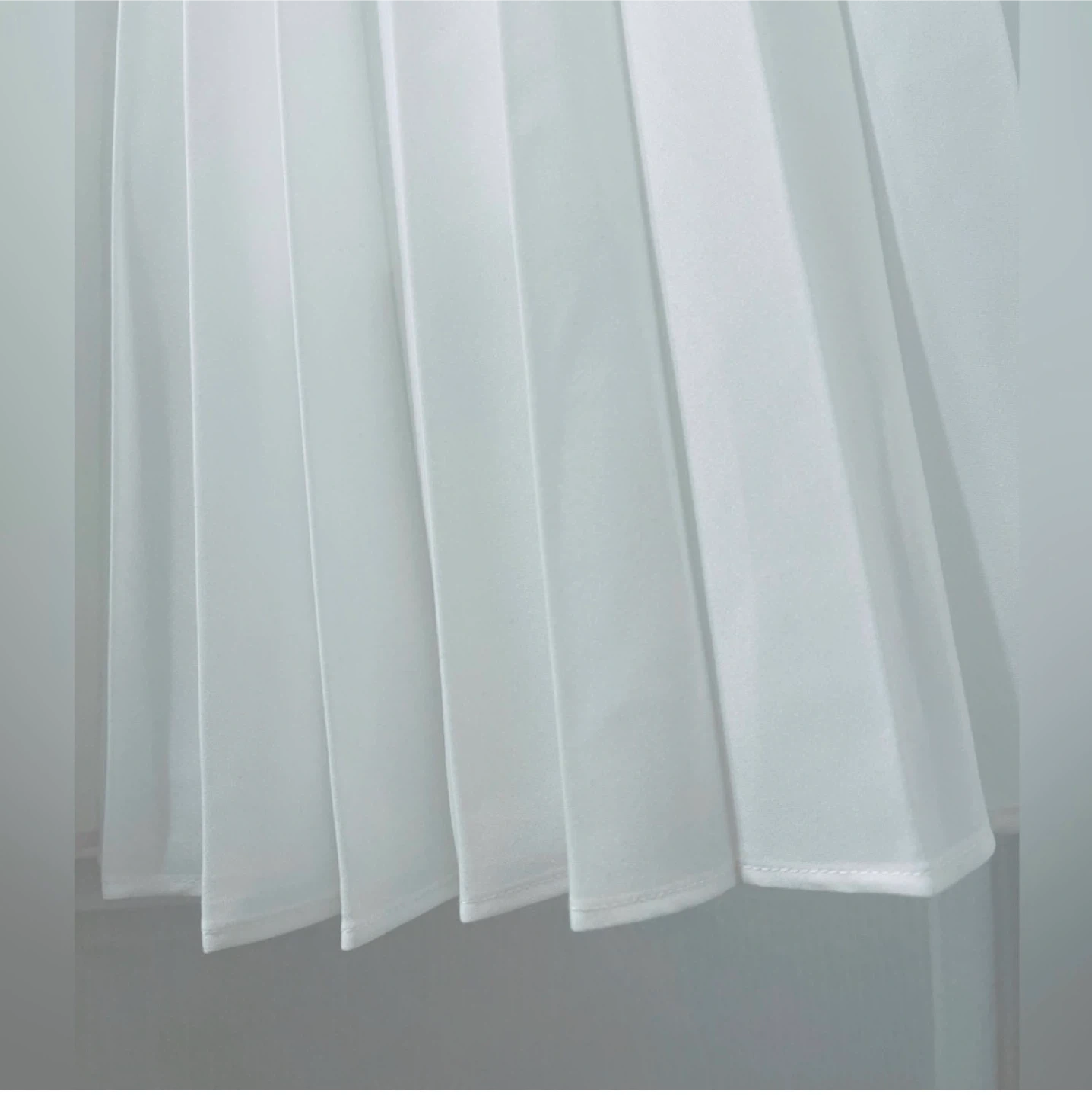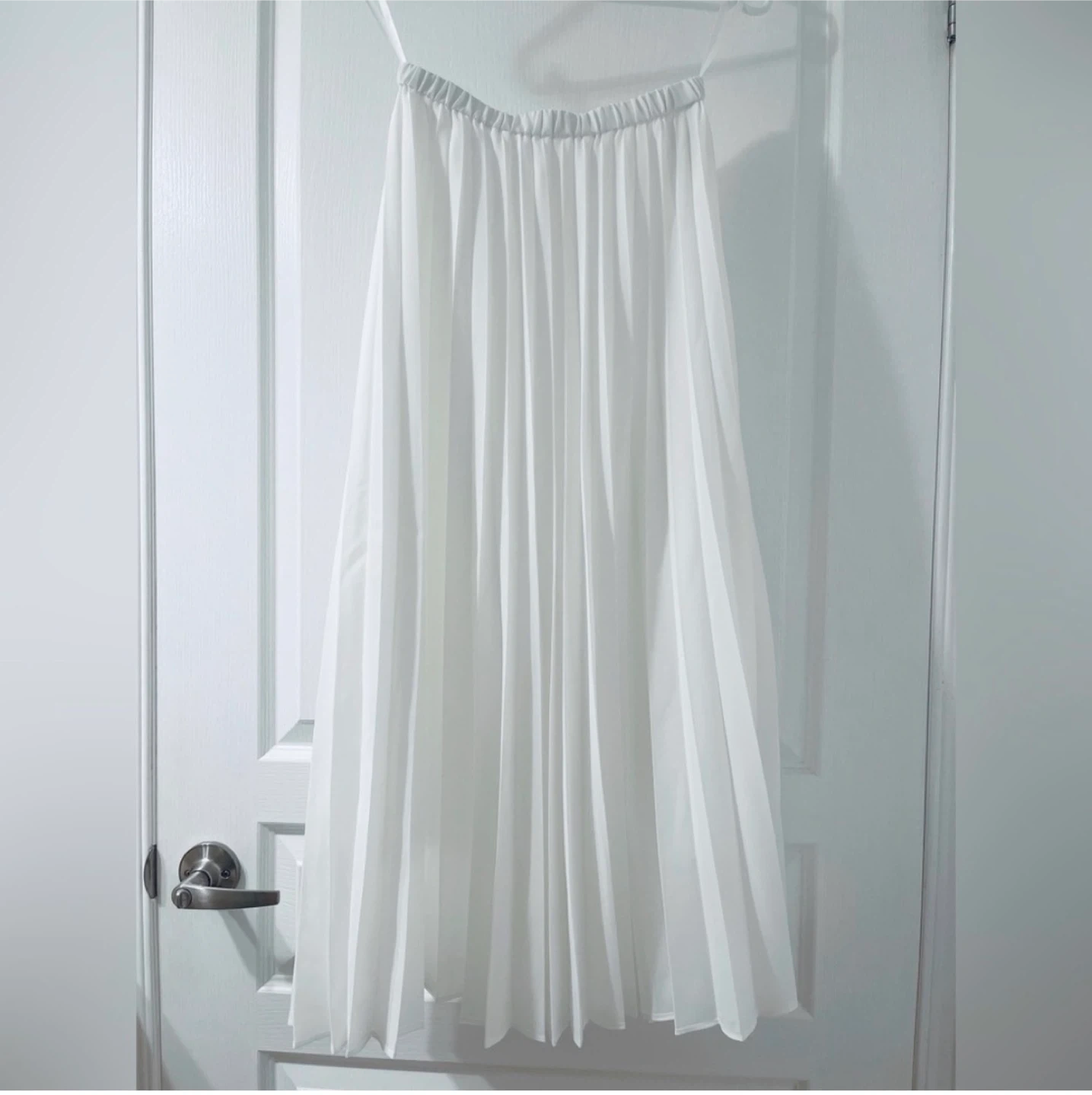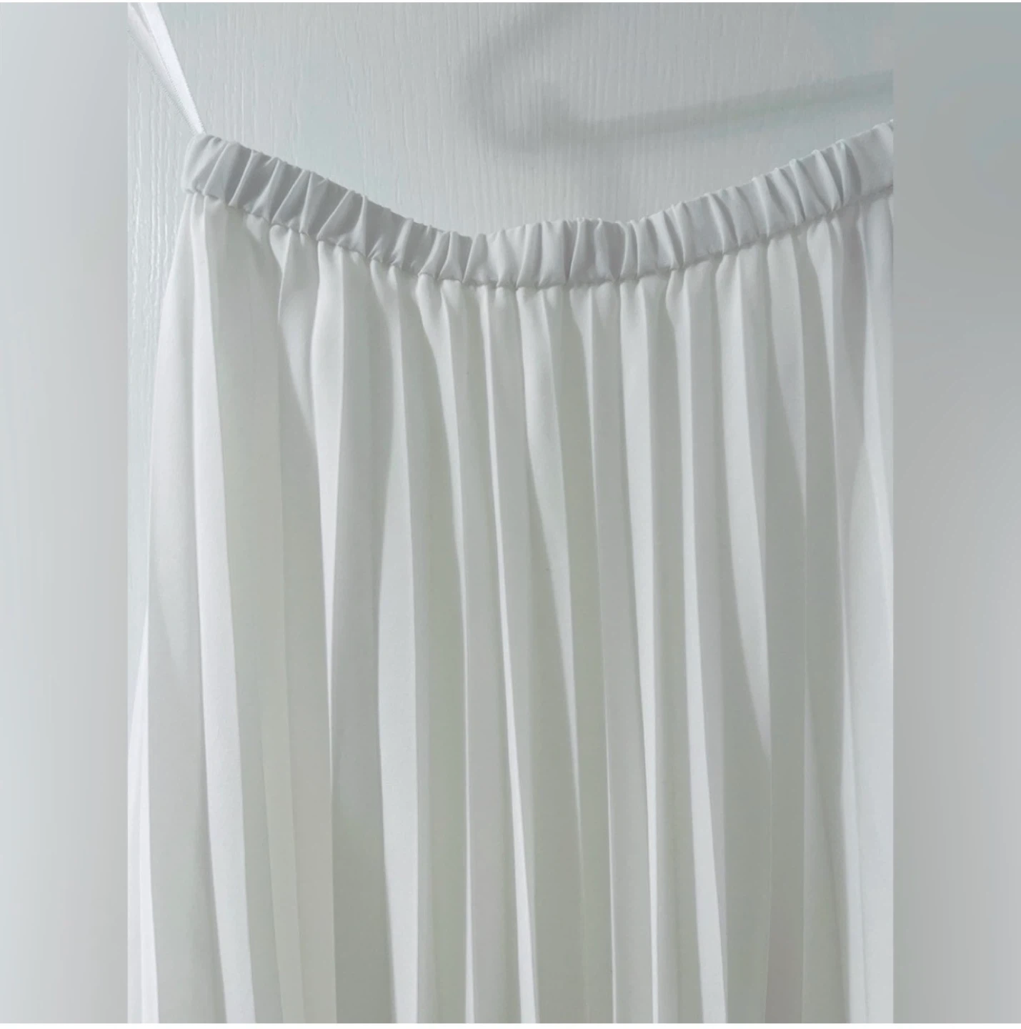 A flowing white pleated midi skirt with an elastic waistband. It's made from a lightweight chiffon-like material, perfect for warmer weather. This skirt is a versatile piece for layering or wearing on its own.