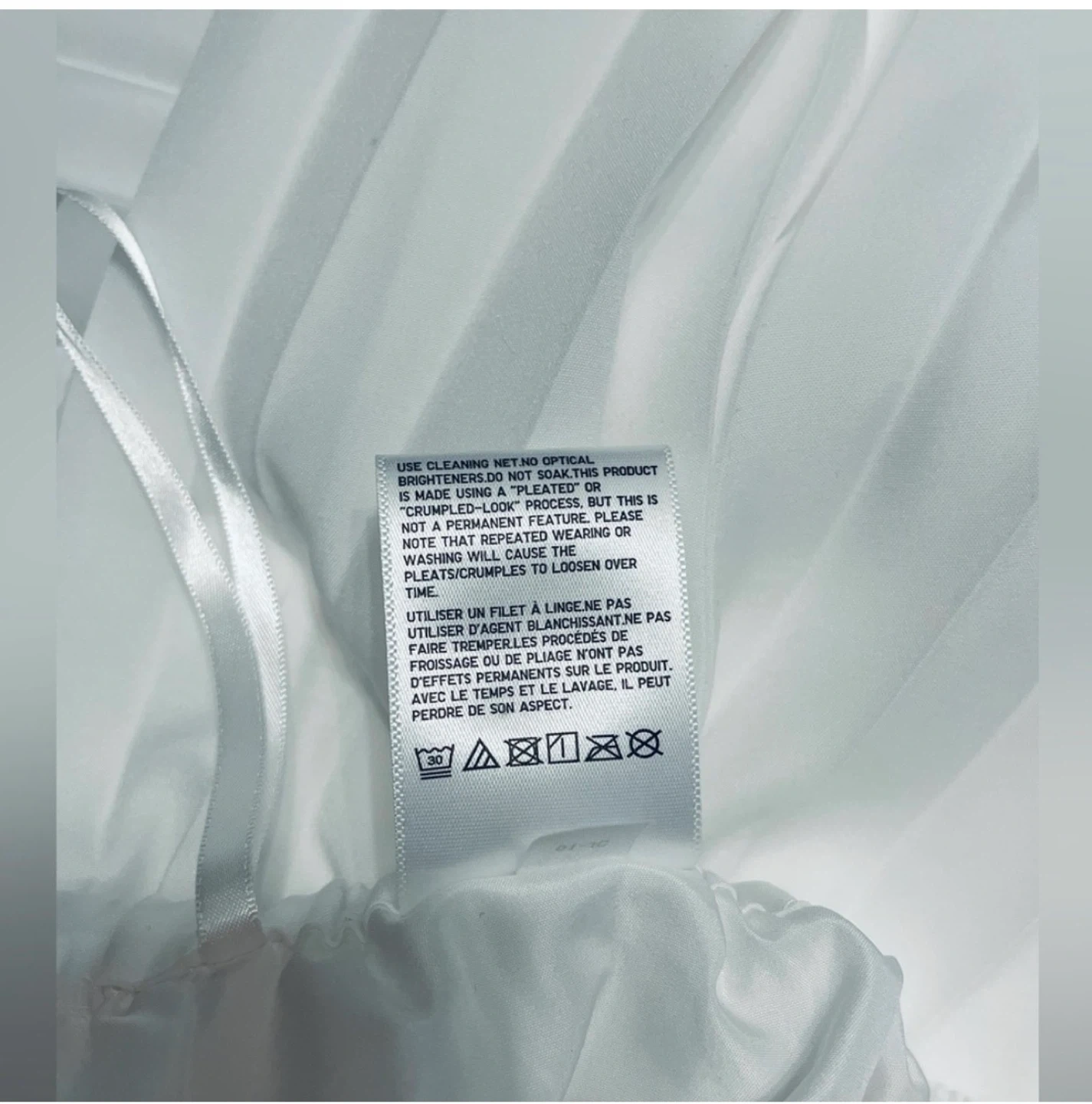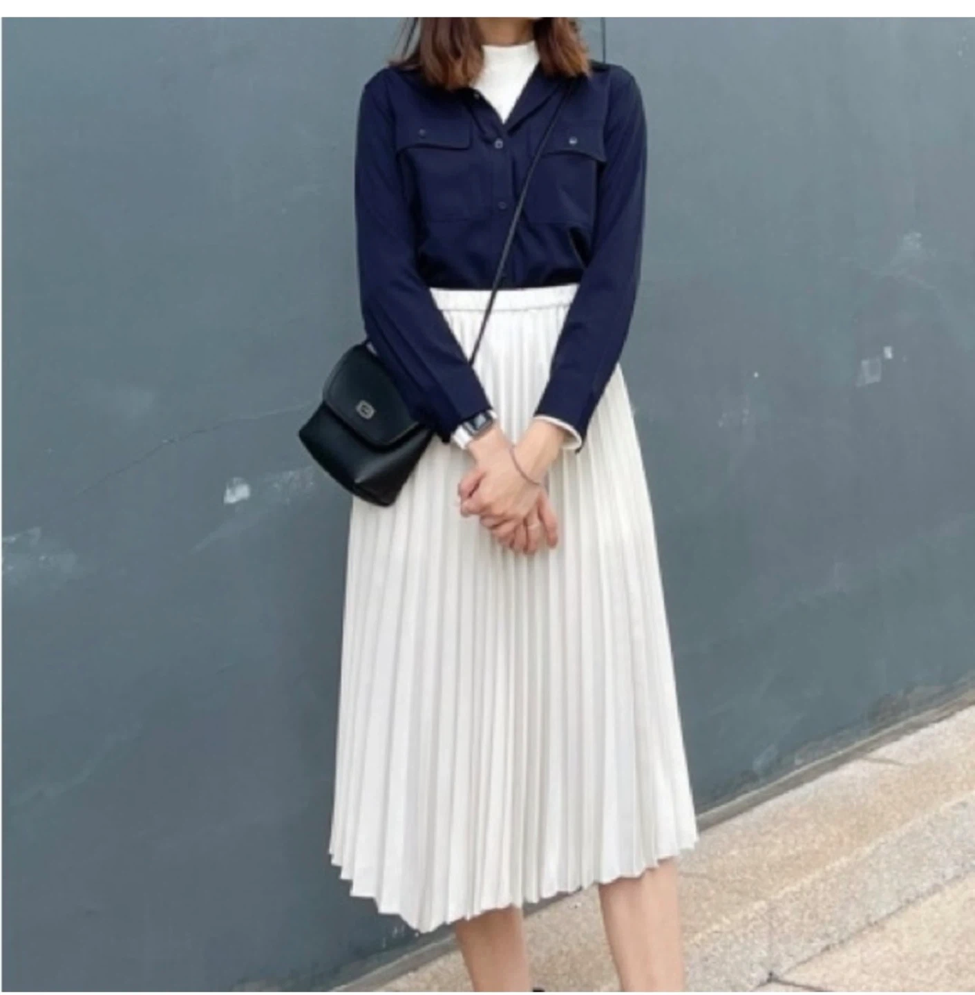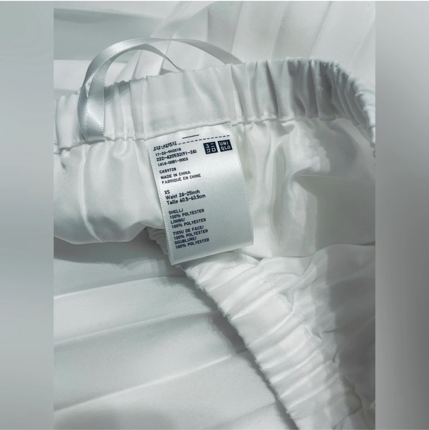 A flowing white pleated midi skirt with an elastic waistband. It's made from a lightweight chiffon-like material, perfect for warmer weather. This skirt is a versatile piece for layering or wearing on its own.