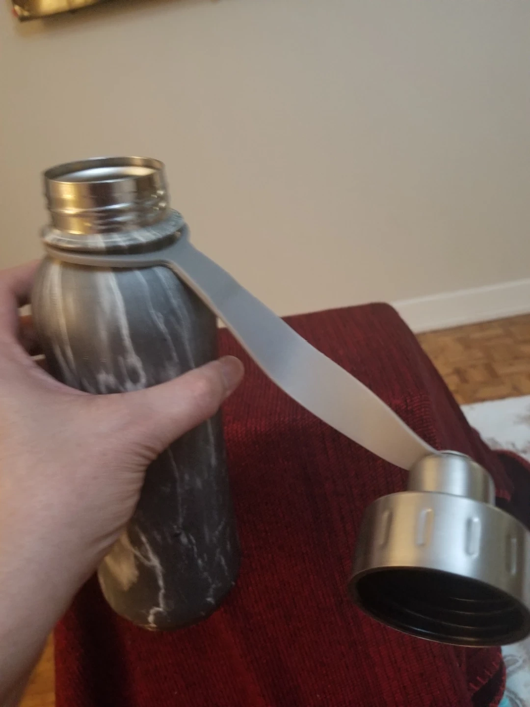 PureHydration reusable water bottle with a stylish grey marble design. It's 800ml capacity is great for staying hydrated. Stainless steel cap and carrying loop included. Pre-owned with good condition.