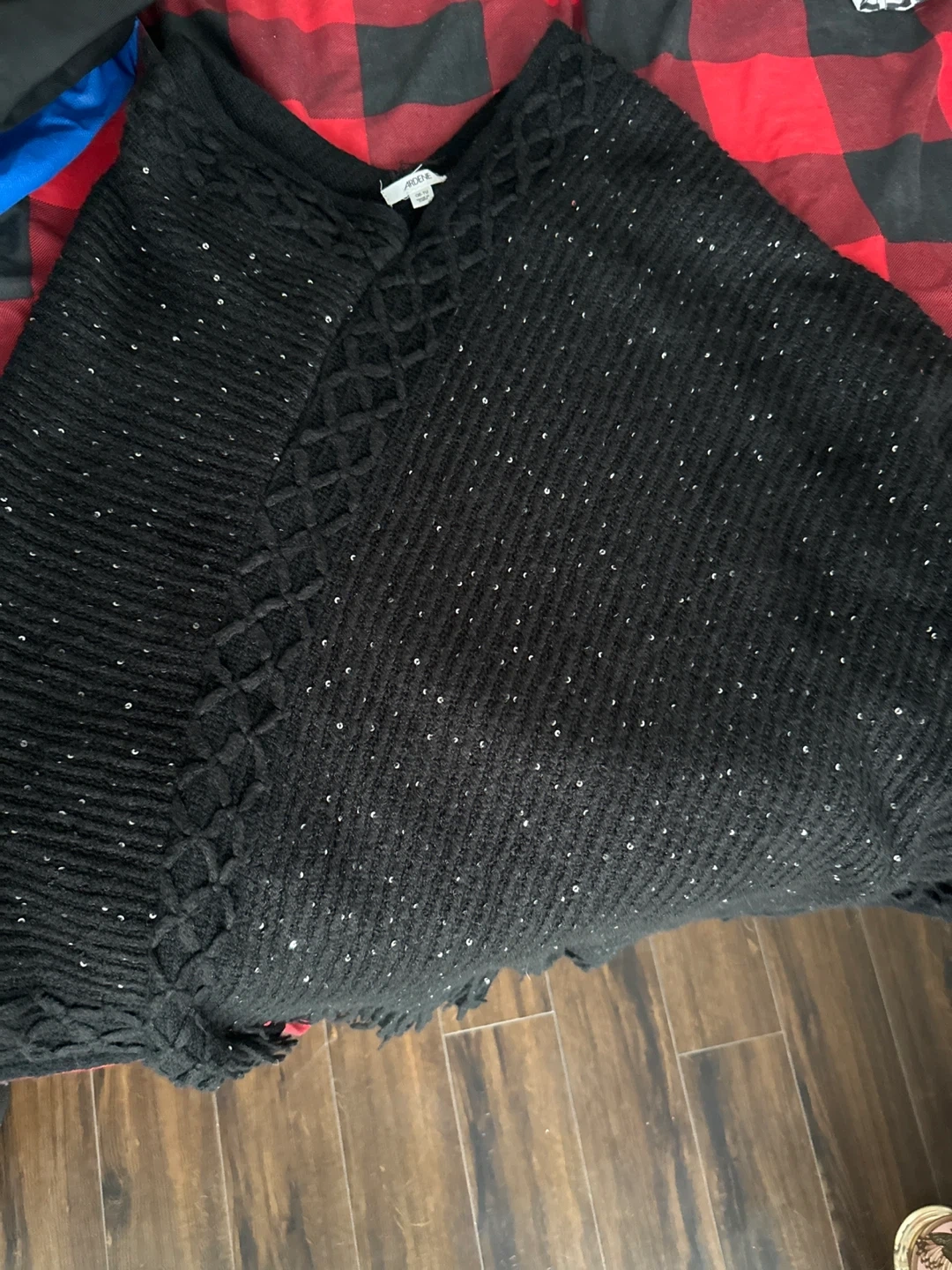 This black poncho is covered in small silver sequins and has braided detailing on the front. It also features a fringe hemline for added style. It's a cozy and sparkly addition to any wardrobe!