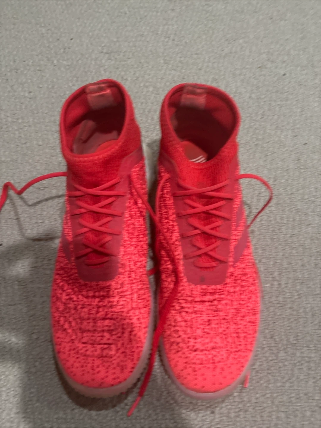 Red Adidas athletic shoes with a knit upper and lace-up closure. Features a cushioned sole for comfort. Ideal for training or casual wear.