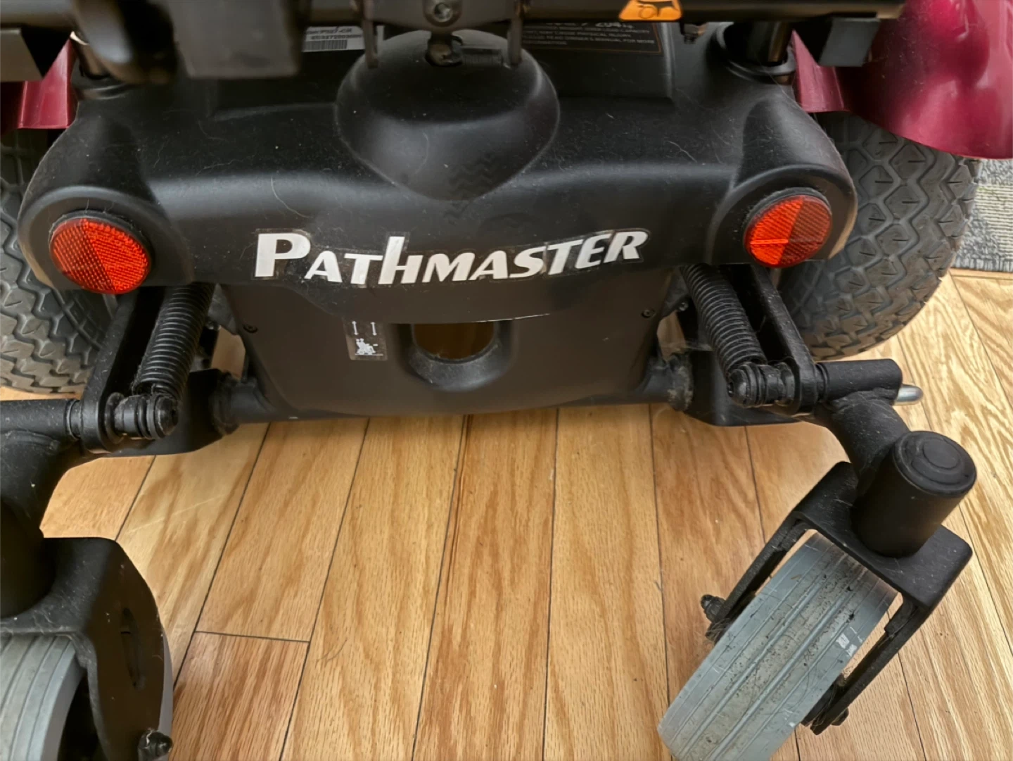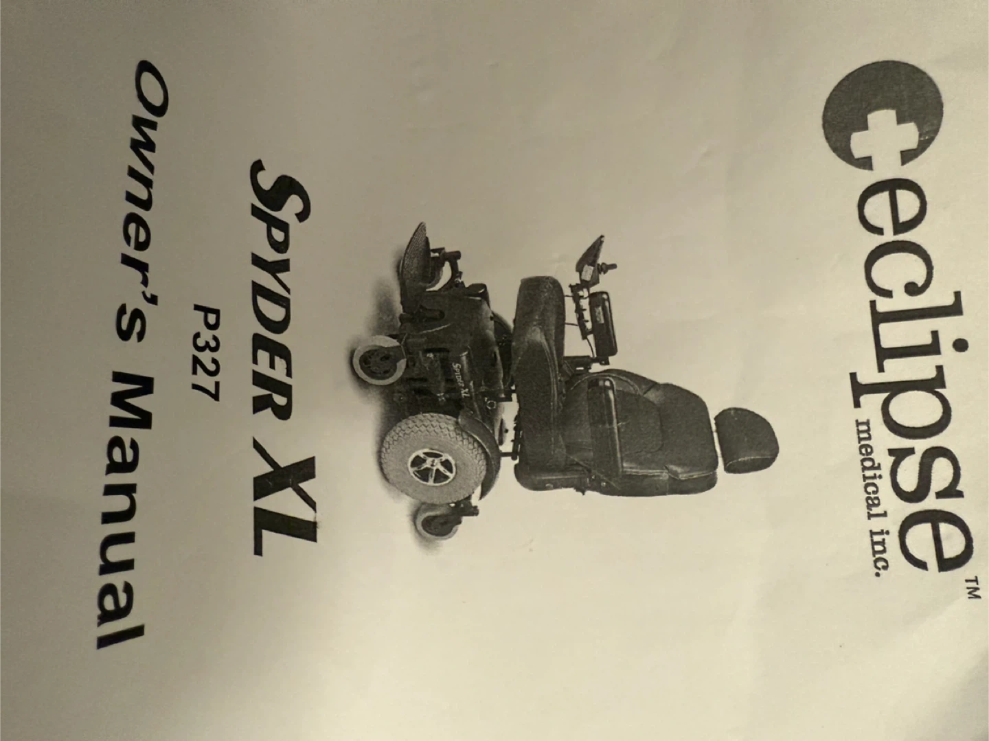 This is an Eclipse PathMaster Spyder XL P327 power wheelchair. It features a black leather-style seat with red accents. The armrests show some wear. Includes the owner's manual. It's designed for mobility assistance.