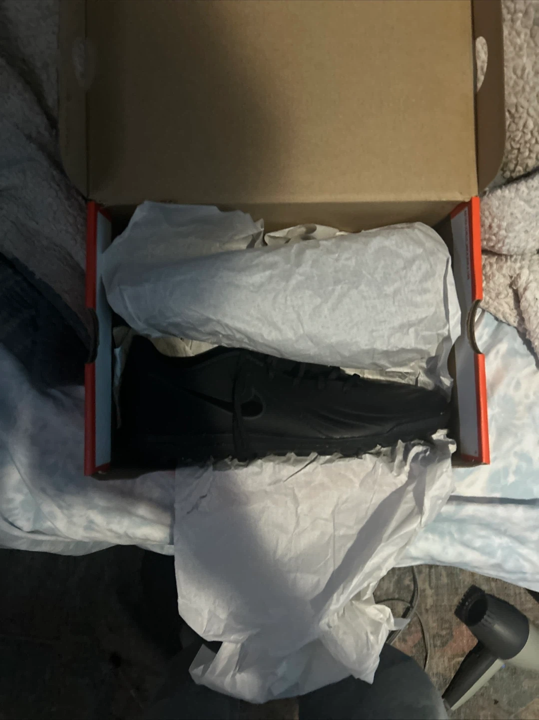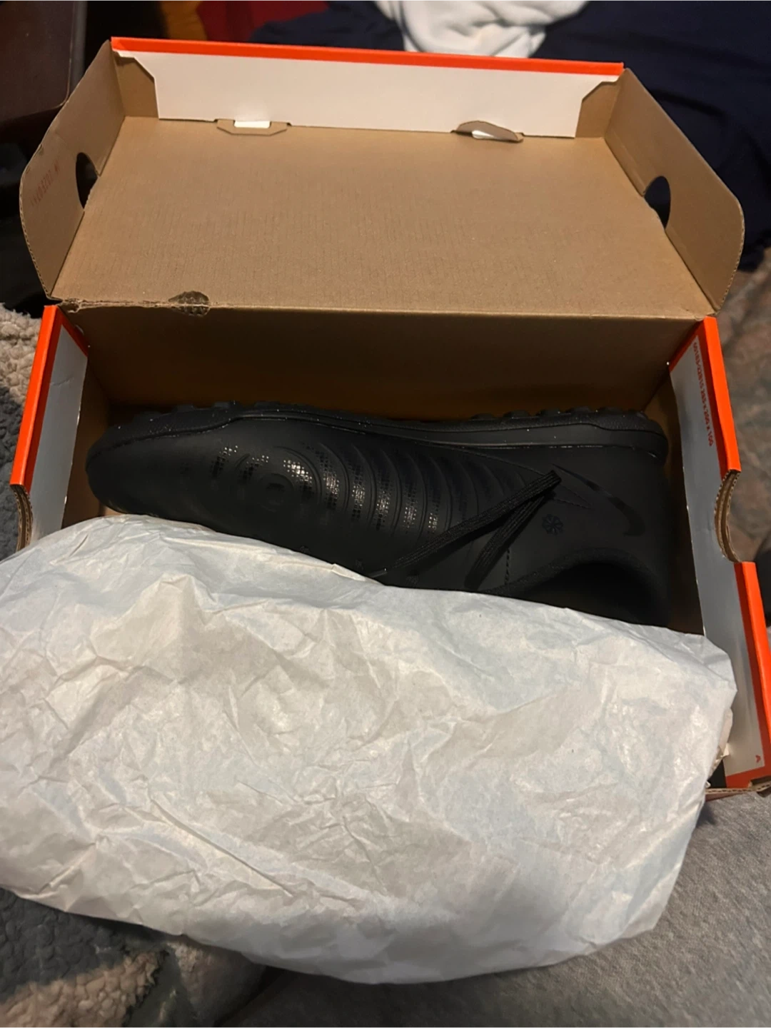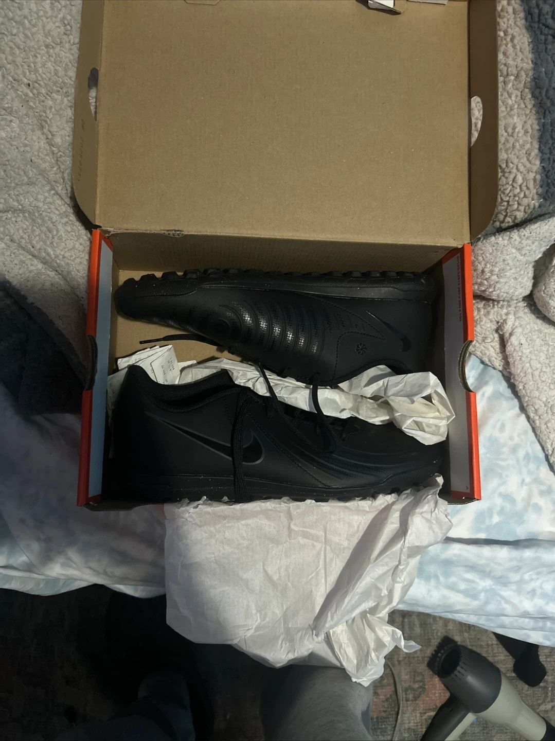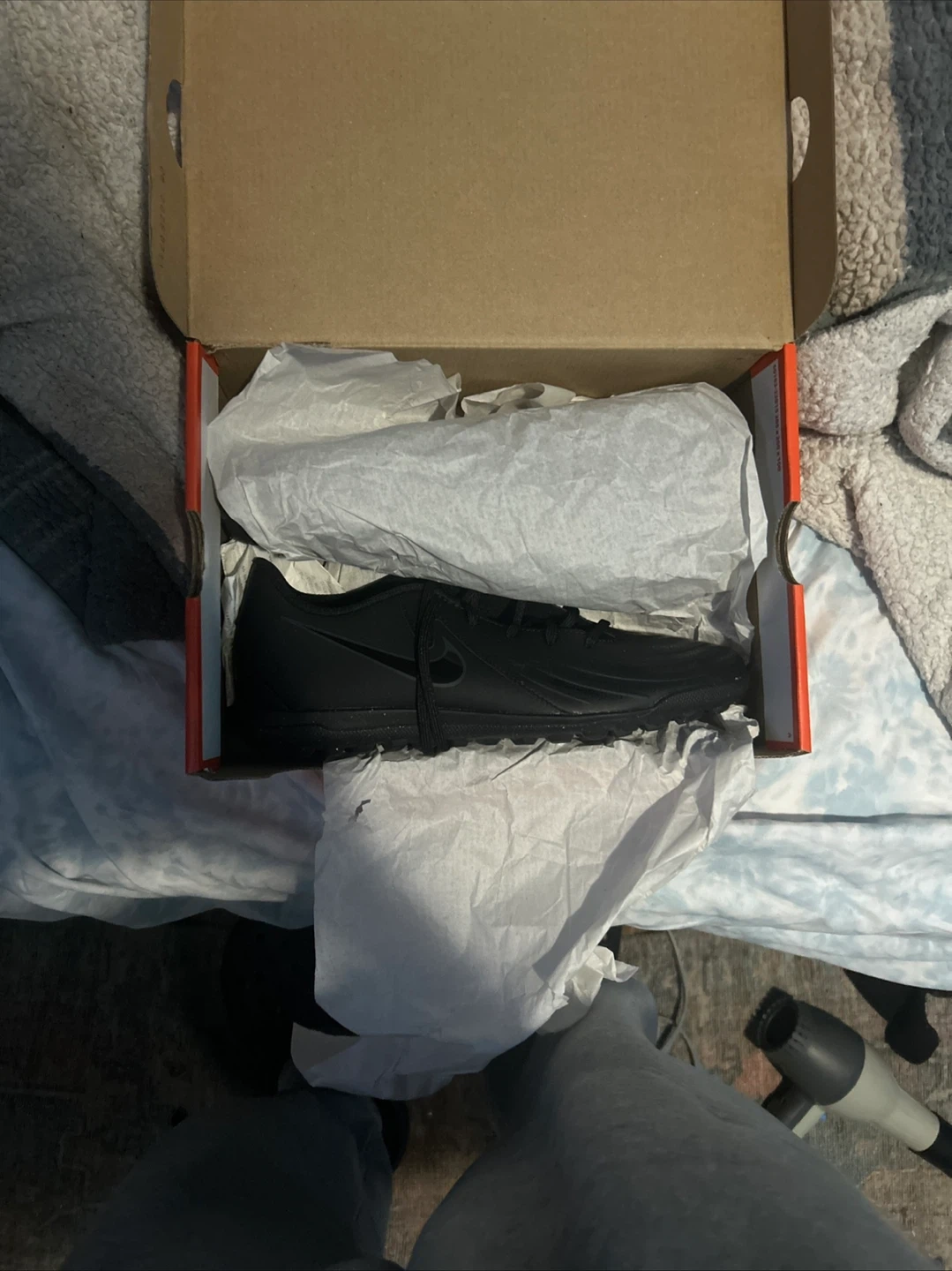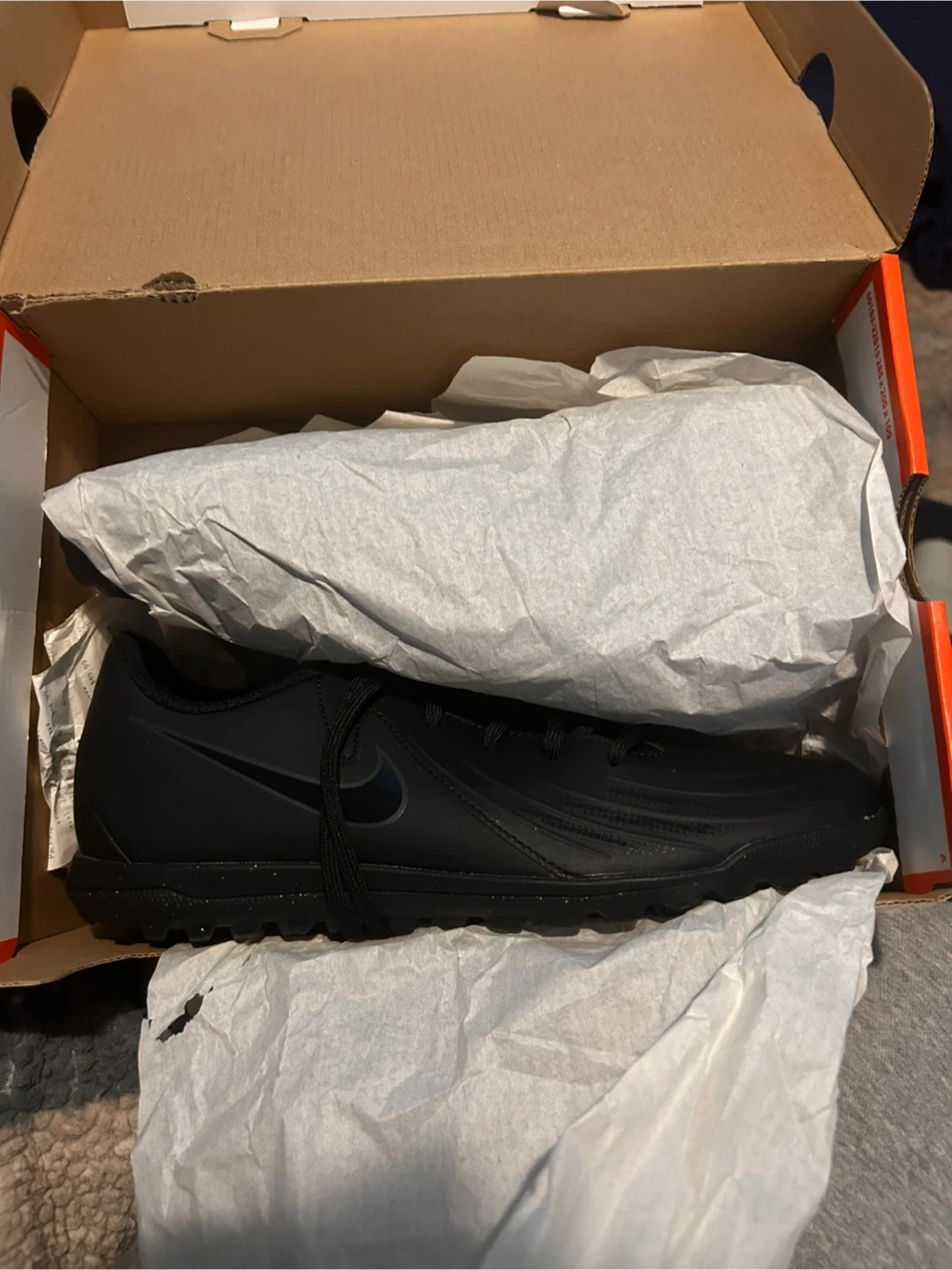 Brand new Nike soccer cleats, all black. These are meant for turf or indoor play. Comes in original Nike box. These cleats are designed for traction and comfort on synthetic surfaces.