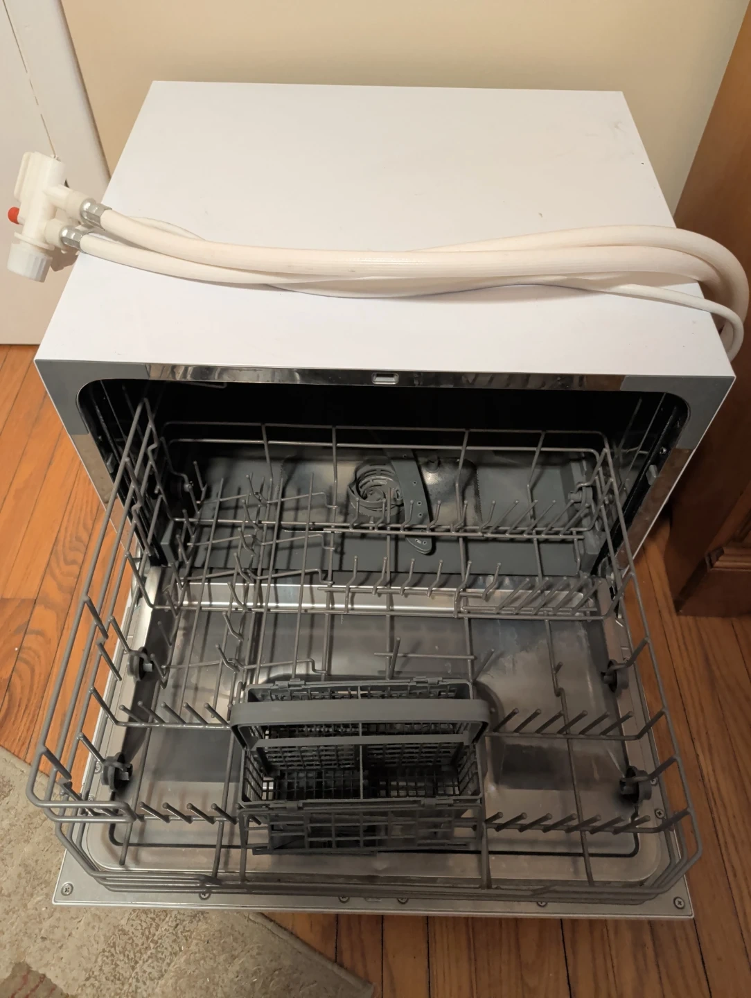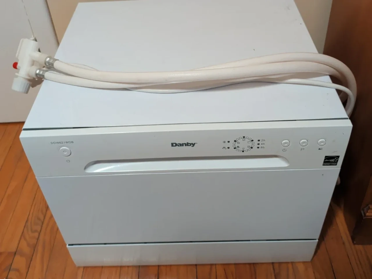 This is a Danby countertop dishwasher, and includes the necessary hoses for connection. The interior features 1 rack for loading dishes. It's a great appliance for small kitchens or apartments!