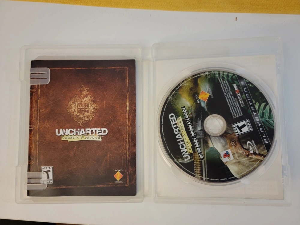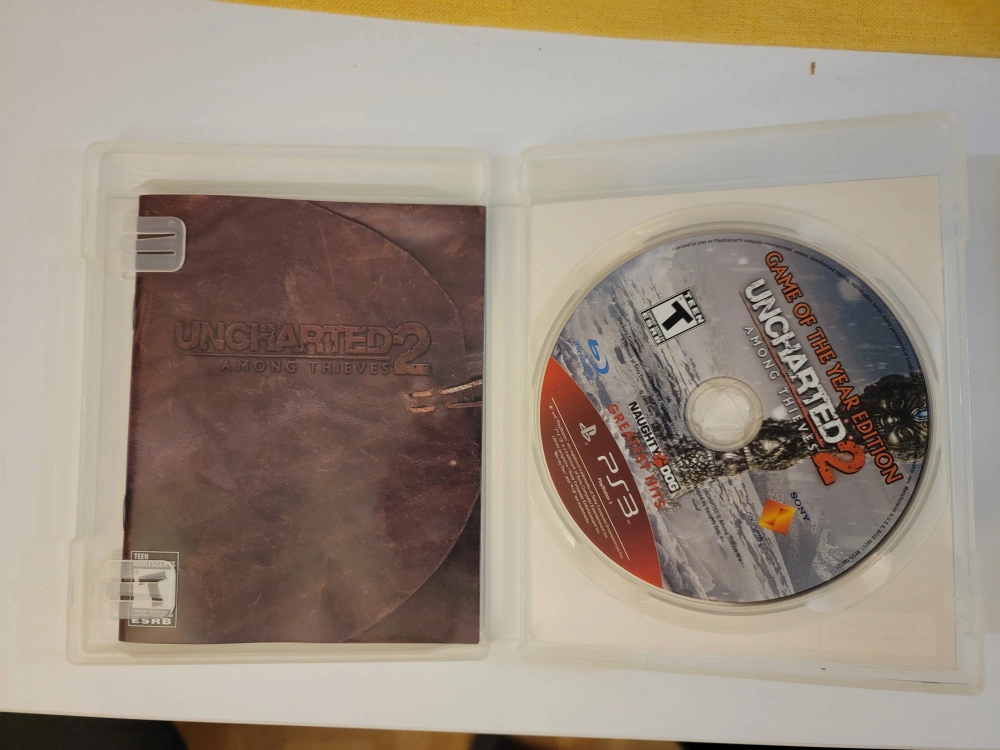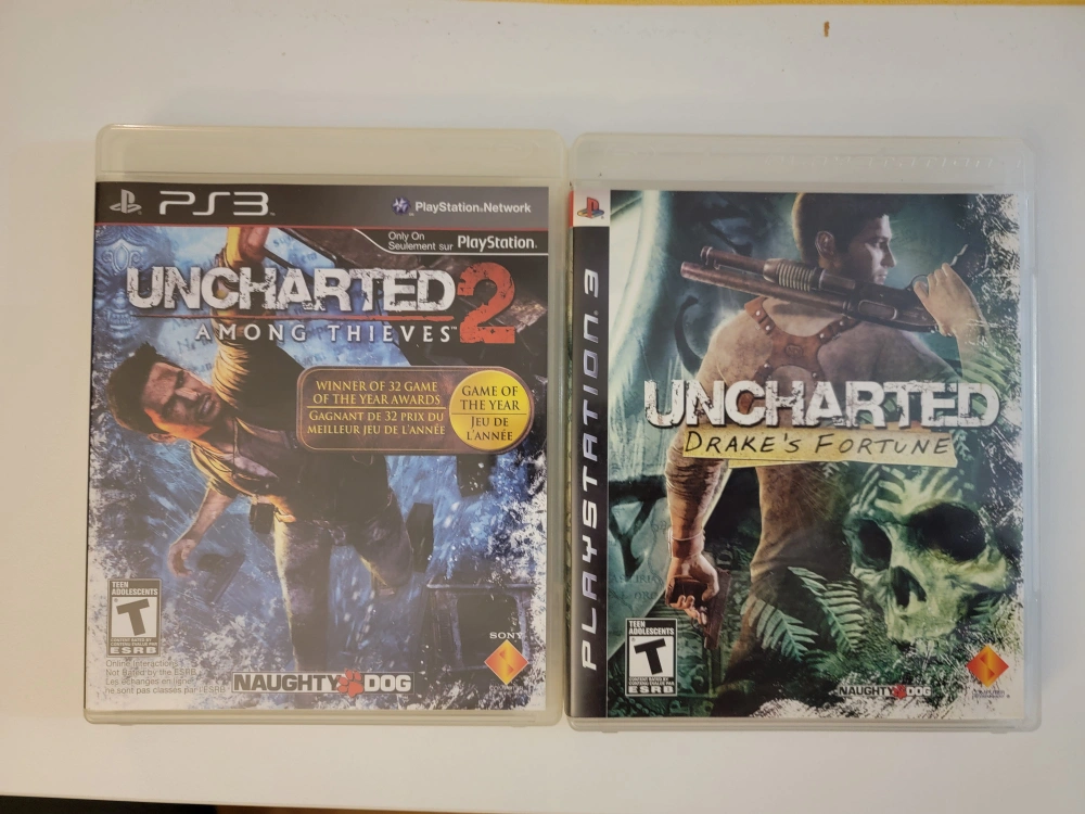A bundle of 2 PS3 games. Both games are in the Uncharted series. One game is Uncharted 2: Among Thieves, and the other is Uncharted: Drake's Fortune.