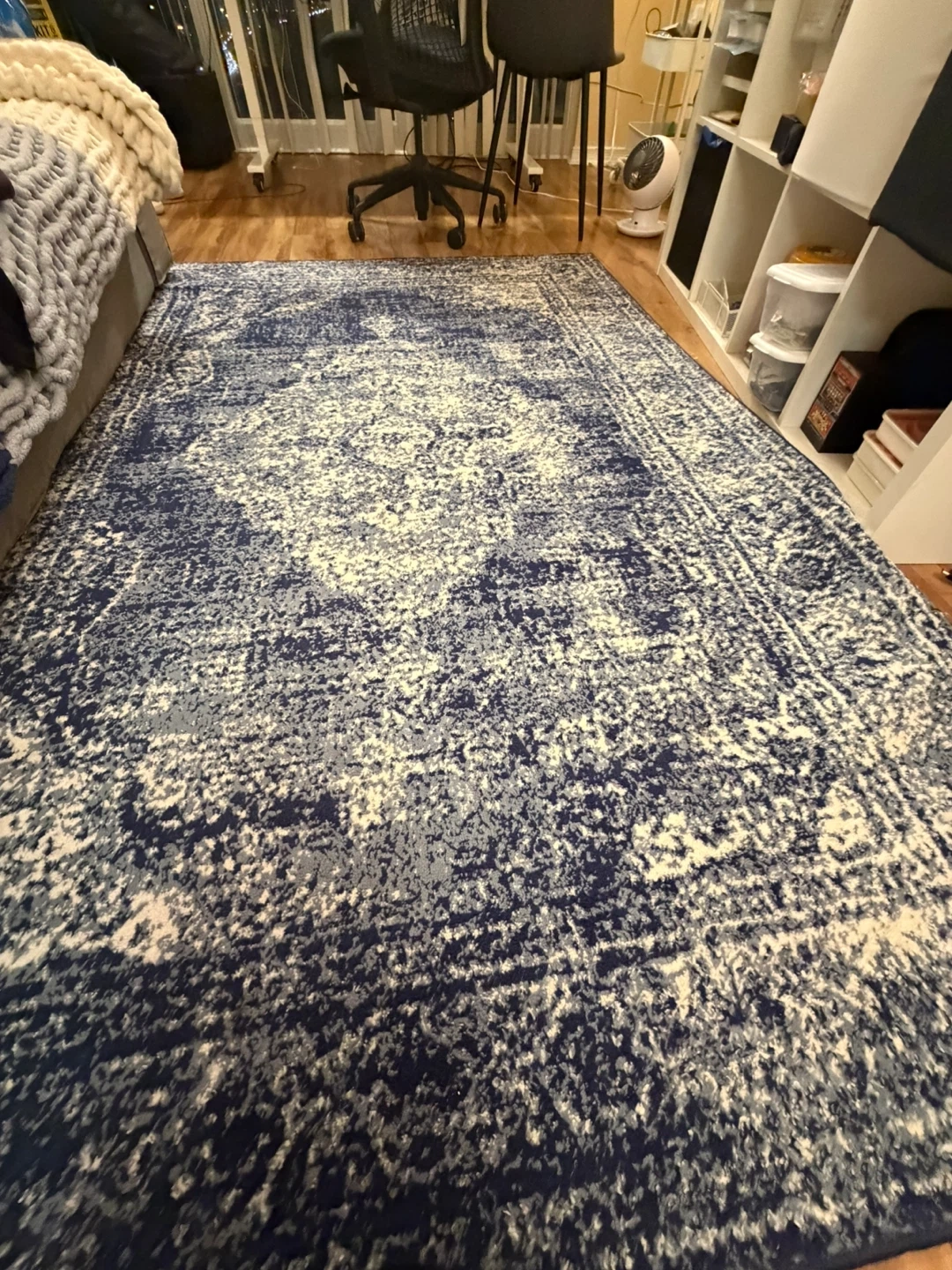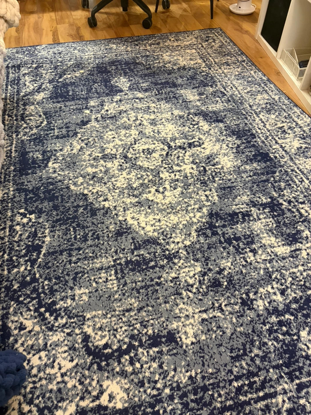 Selling an A2Z Rug with a Santorini Navy Blue Medallion design! This modern distressed area rug is perfect for a living room. It features a soft, short medium pile and measures 160x230cm, which is 5'3" x 7'7"