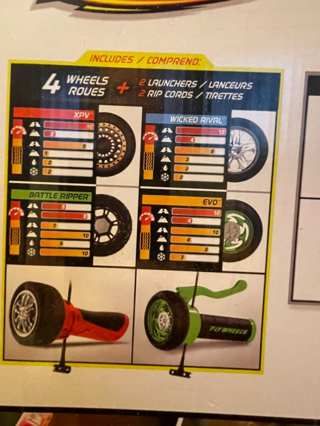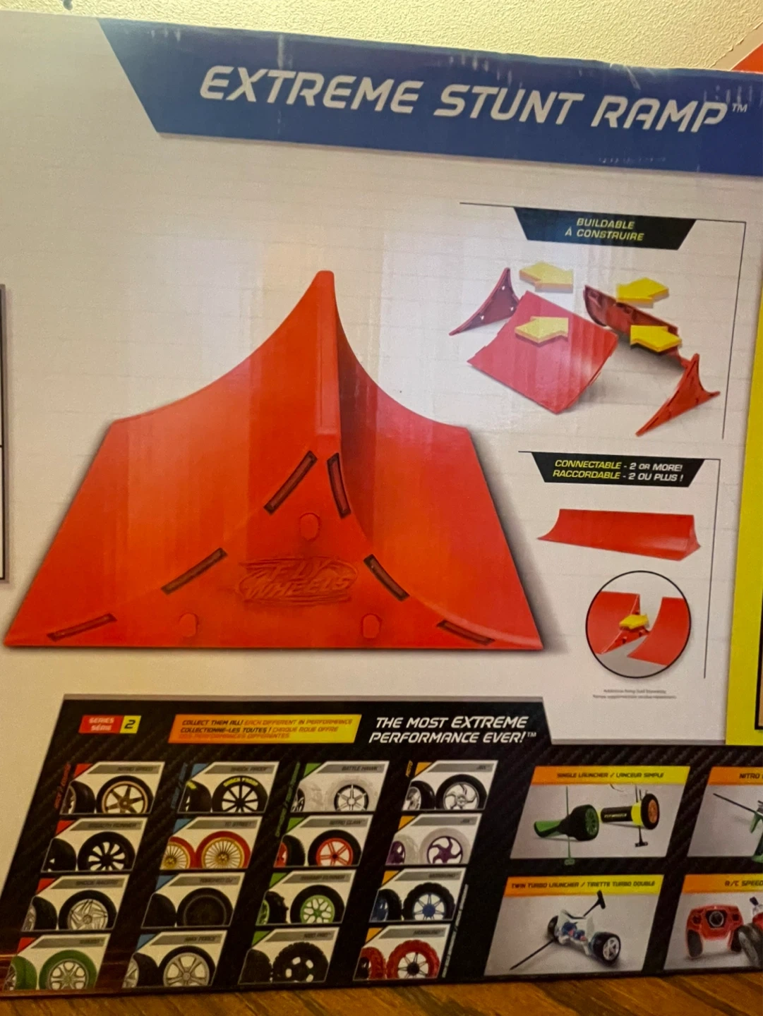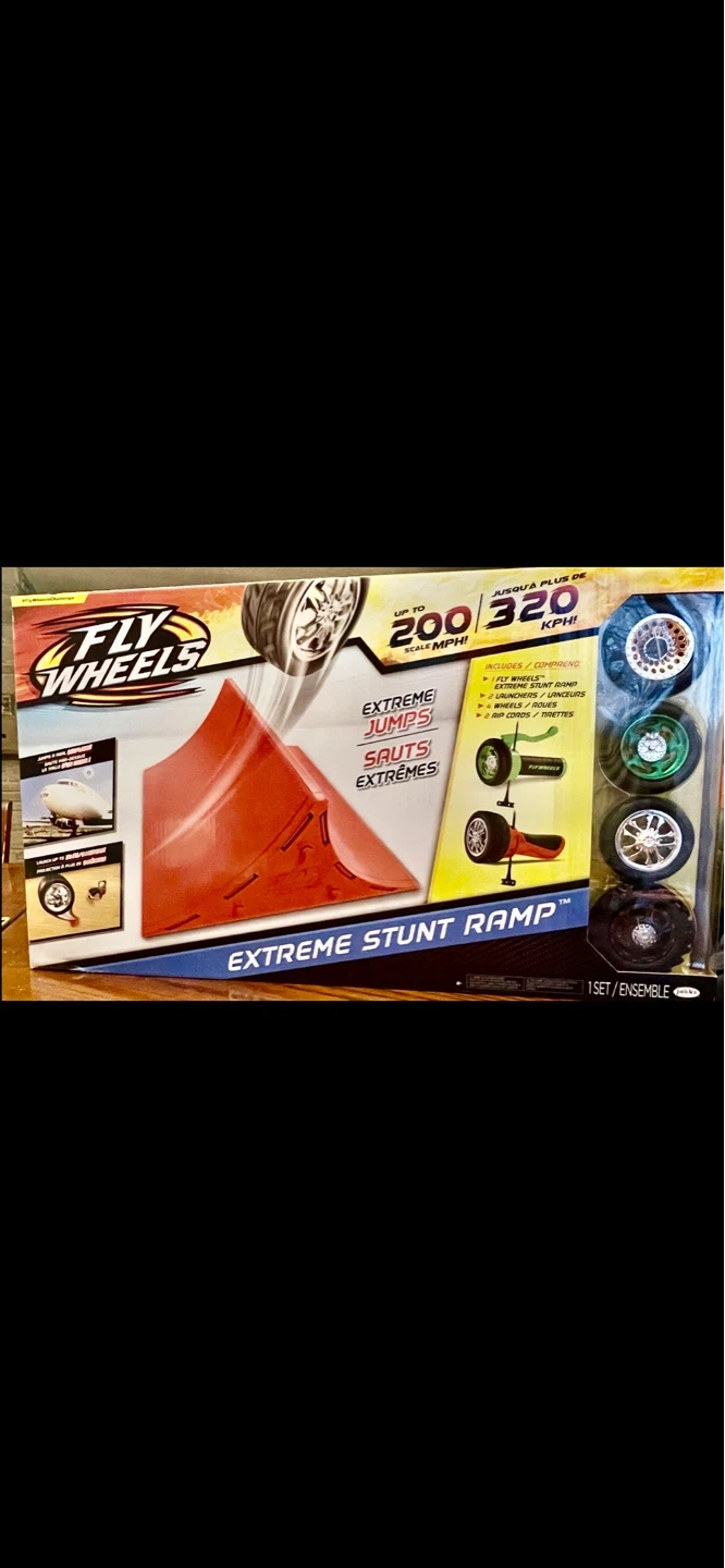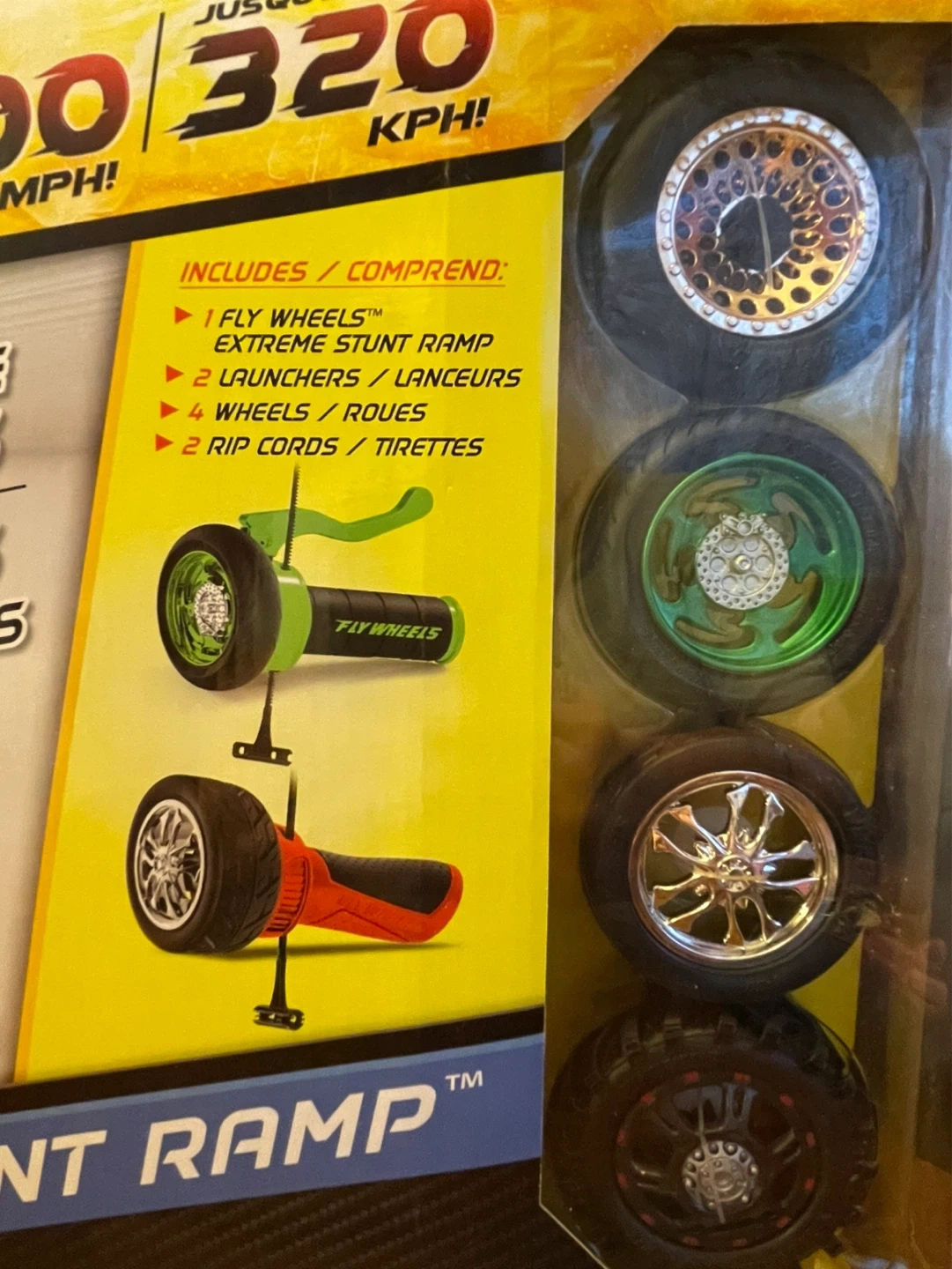 Includes 1 Fly Wheels Extreme Stunt Ramp, 2 launchers, 4 wheels, and 2 rip cords. Build and connect multiple ramps for even bigger stunts! This usually comes with only one launcher and two wheels. This particular one has two launchers and four wheel wheels.
