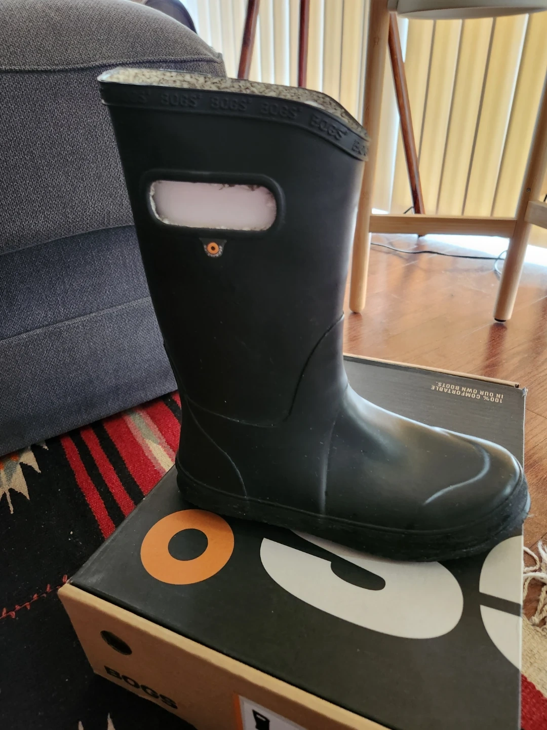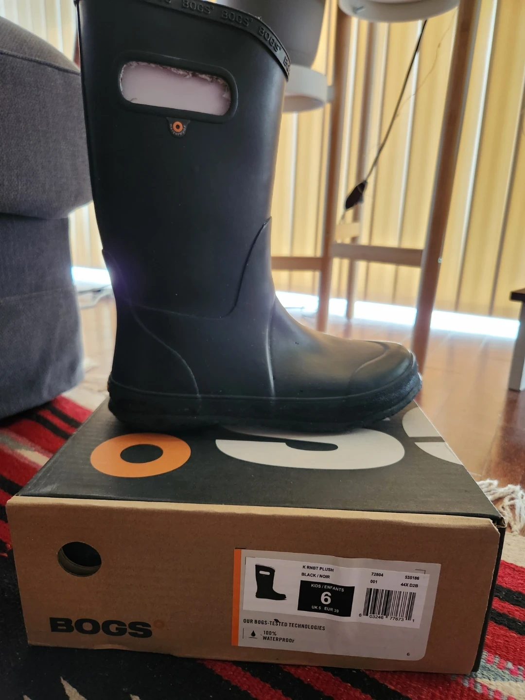 BOGS plush rainboots, 100% waterproof, lightweight construction, plush lined for extra warmth, Max-Wick evaporates sweat to keep feet dry, comfort rated -15 C. Comes with Original box, size 6 for bigger kids, 39 EU can fit adults too.