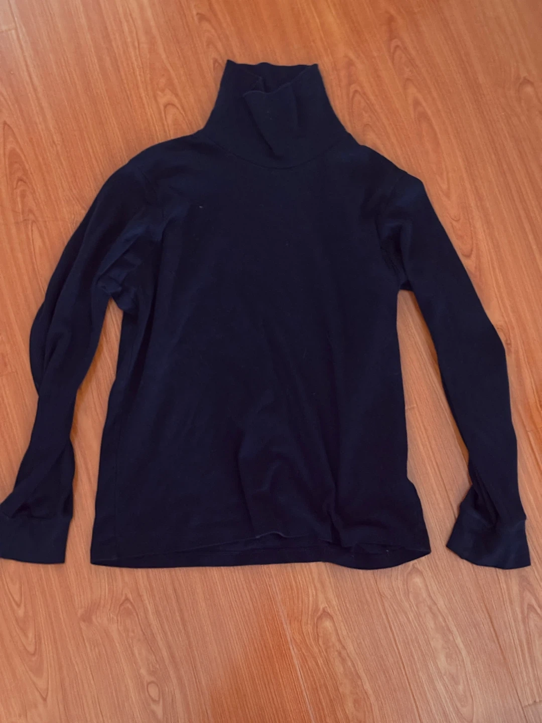 A simple black long-sleeve turtleneck top. It's a size S/P. This top is suitable for layering on cooler days.