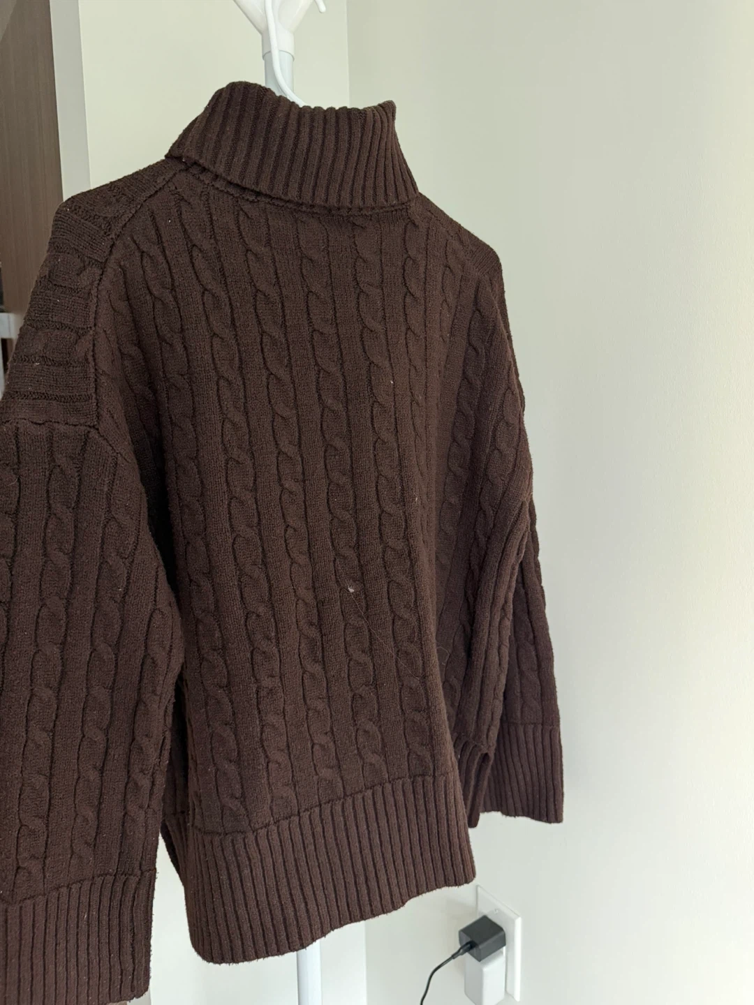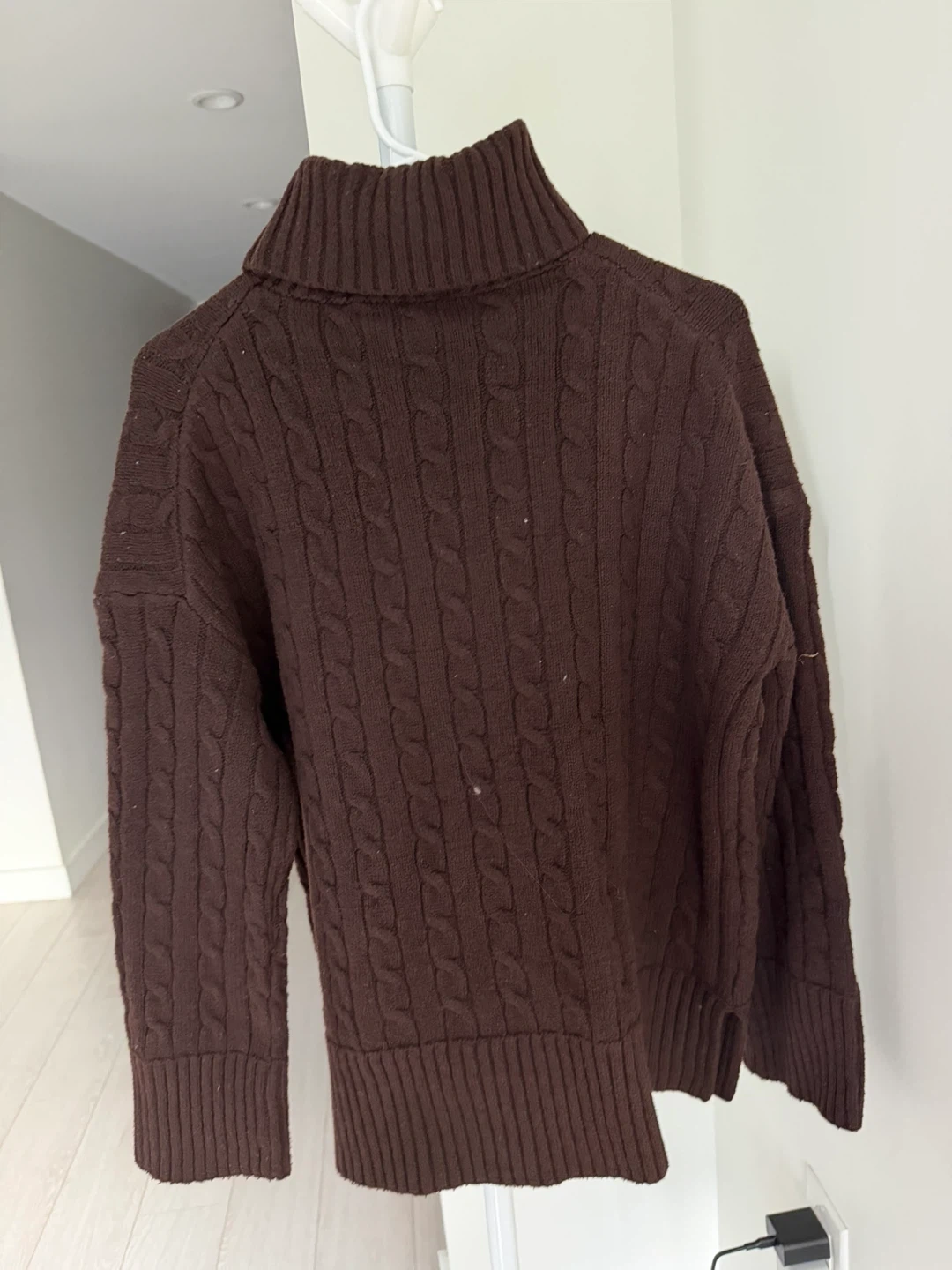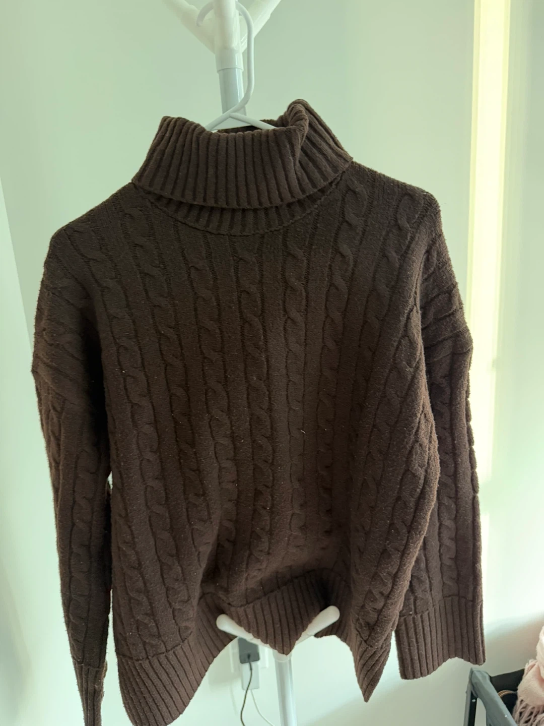 Cozy up in this lovely brown cable knit turtleneck sweater! It's perfect for those chilly Canadian days and nights. The texture is so soft and the colour is a rich, warm brown