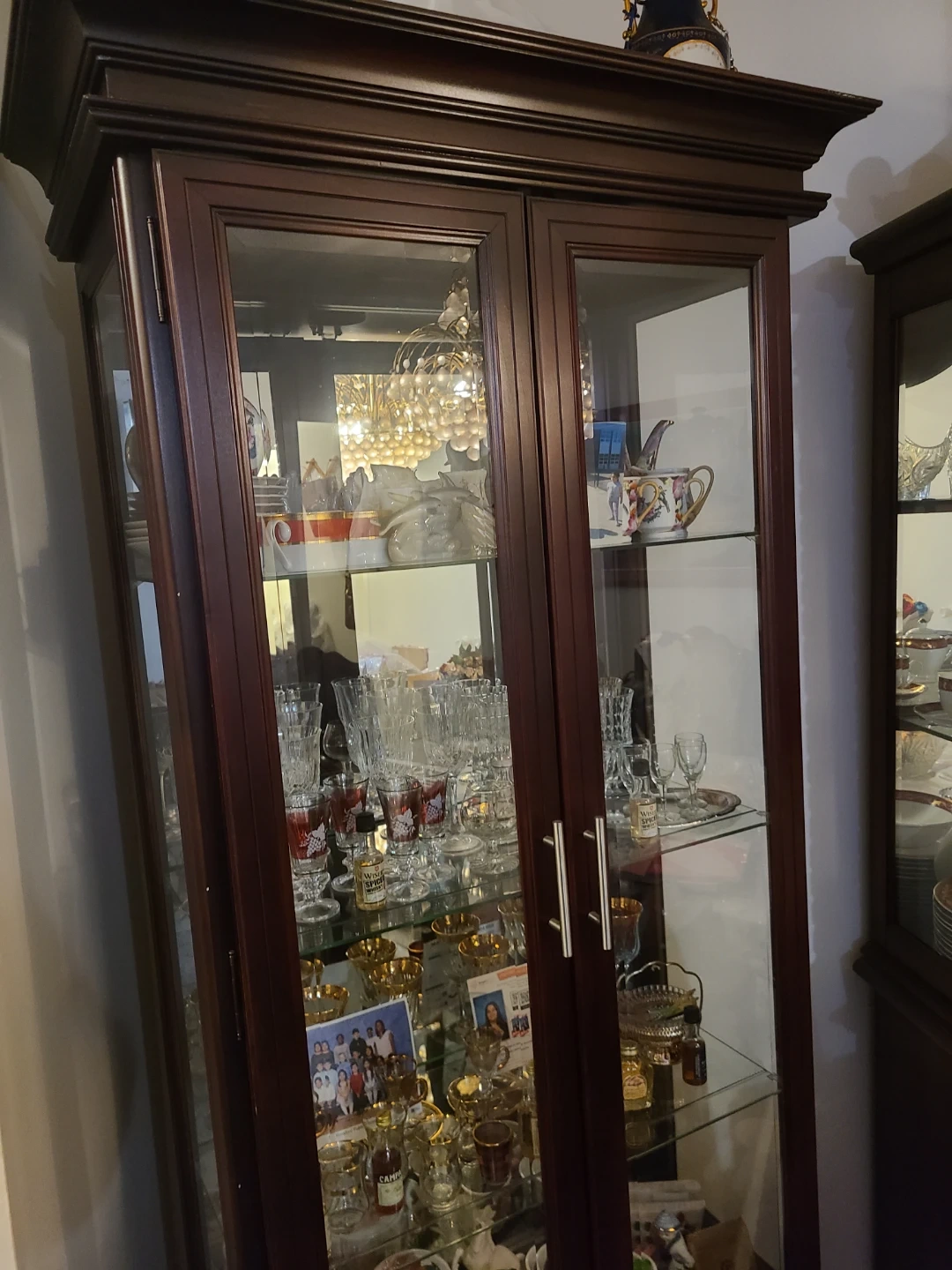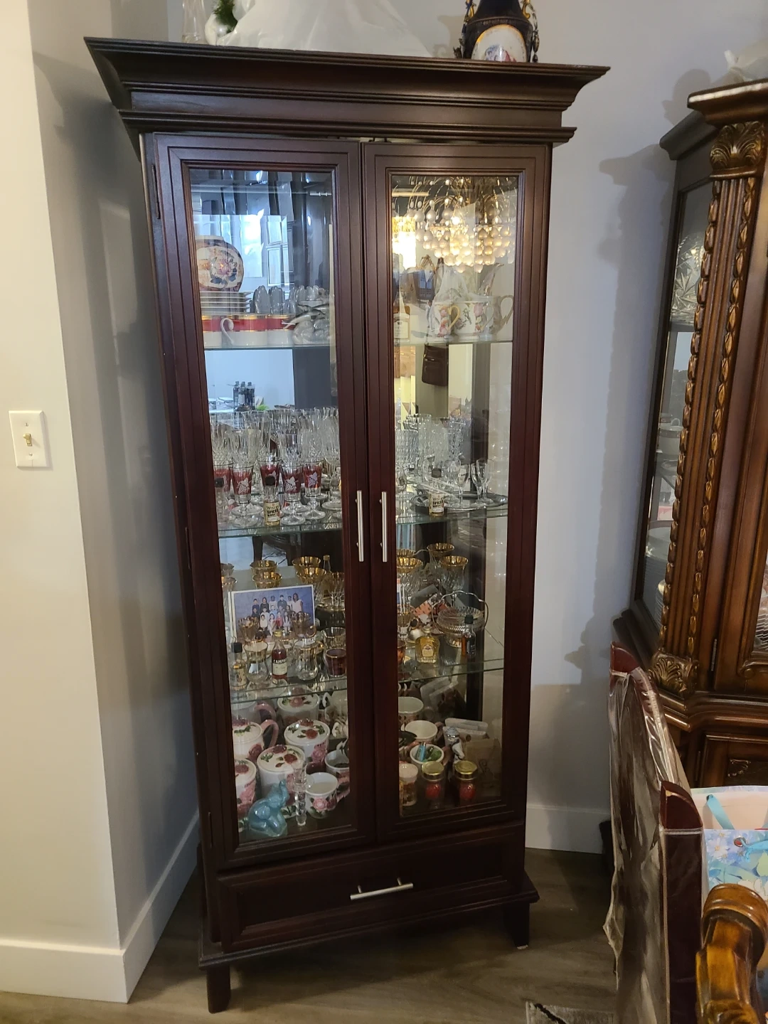 A dark wood display cabinet with glass doors. It has multiple shelves perfect for showcasing dishes and collectibles. Includes a bottom drawer for extra storage. This cabinet would be great for a dining room or living space!