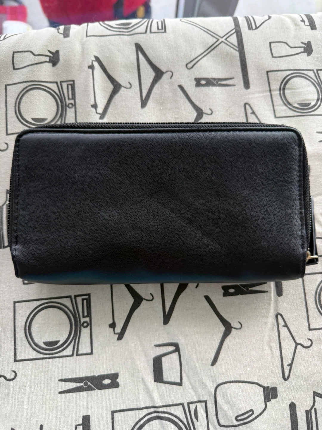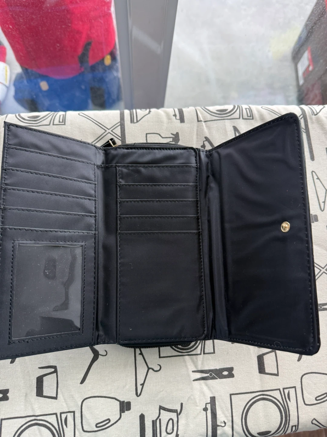 This black quilted wallet features a gold-tone "J" logo. It has multiple card slots, a clear ID window, and a zippered coin pocket. Plenty of space for your essentials!