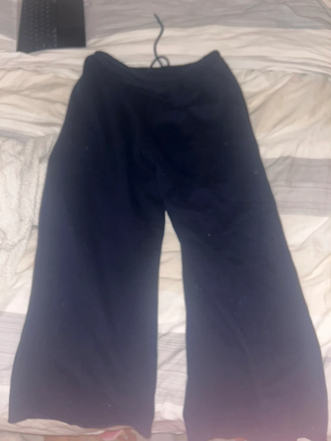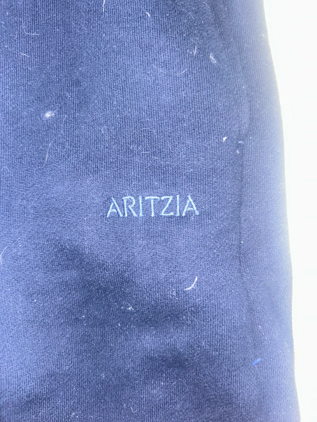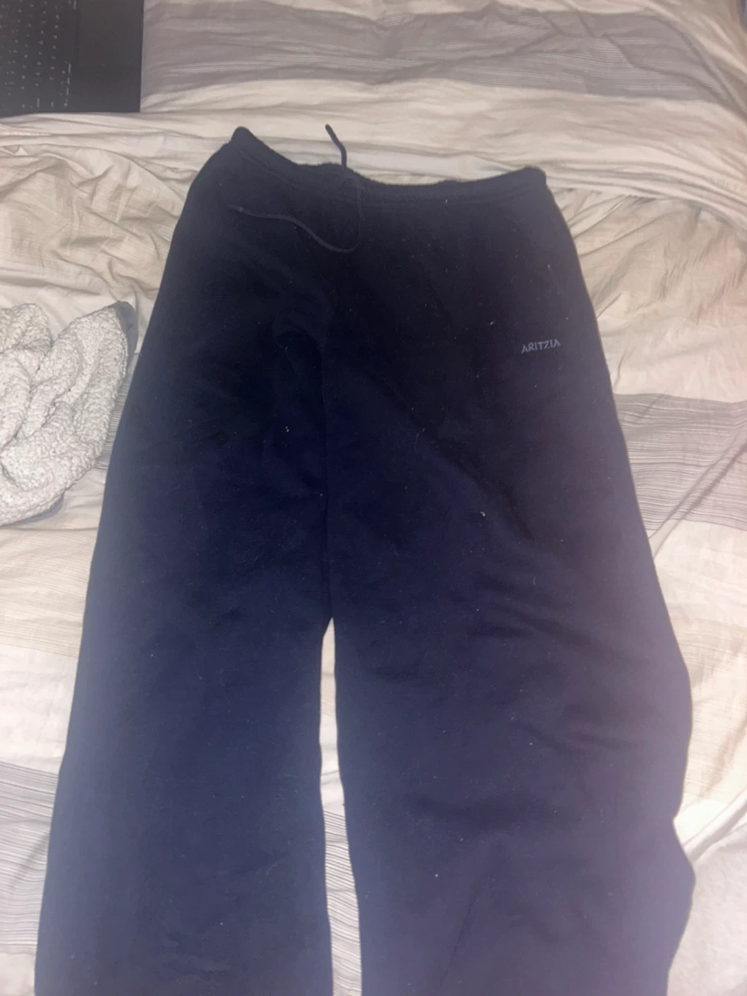 These navy sweatpants are from Aritzia. They have a wide-leg silhouette and a drawstring waist. Cotton blend material.