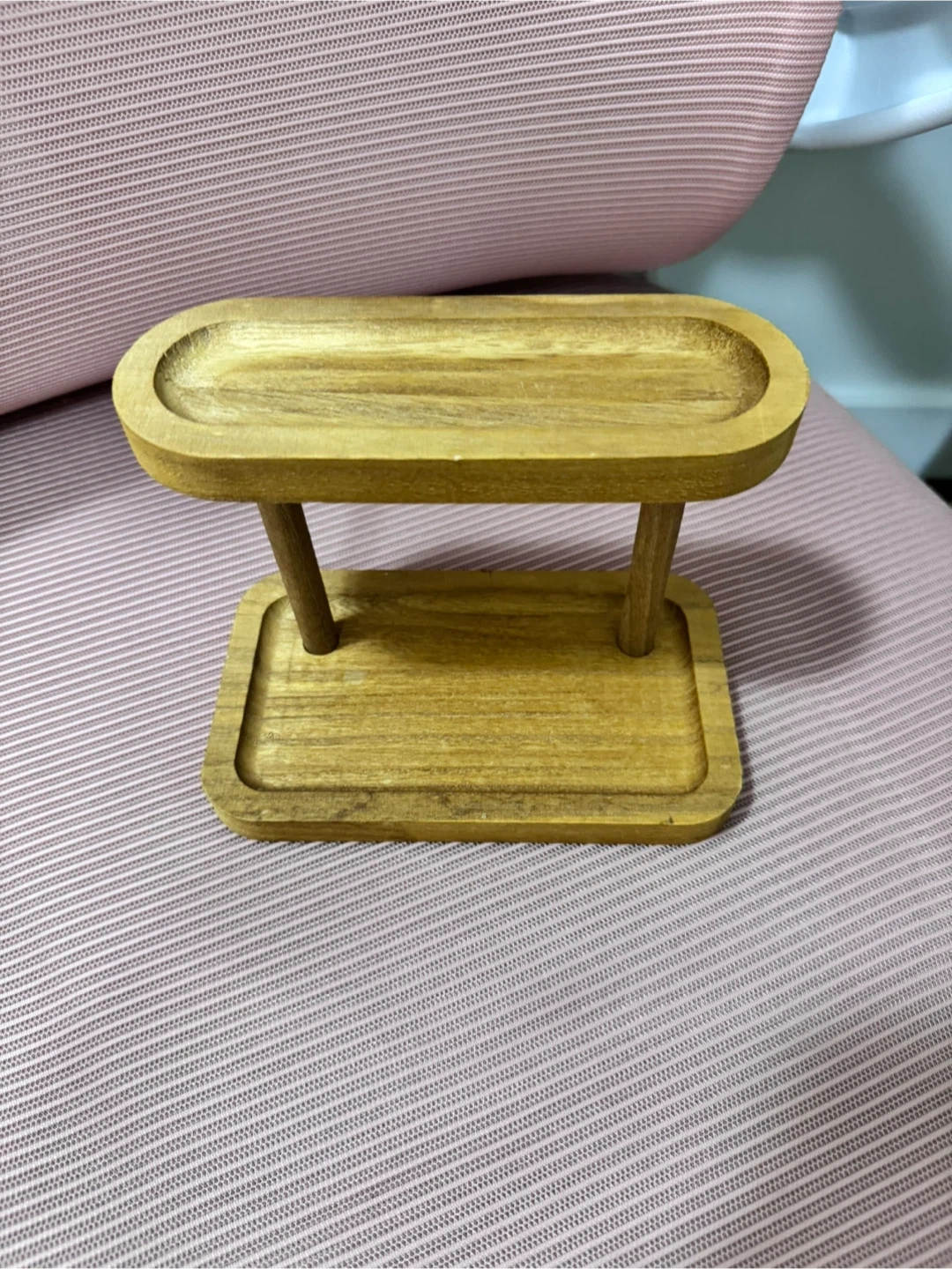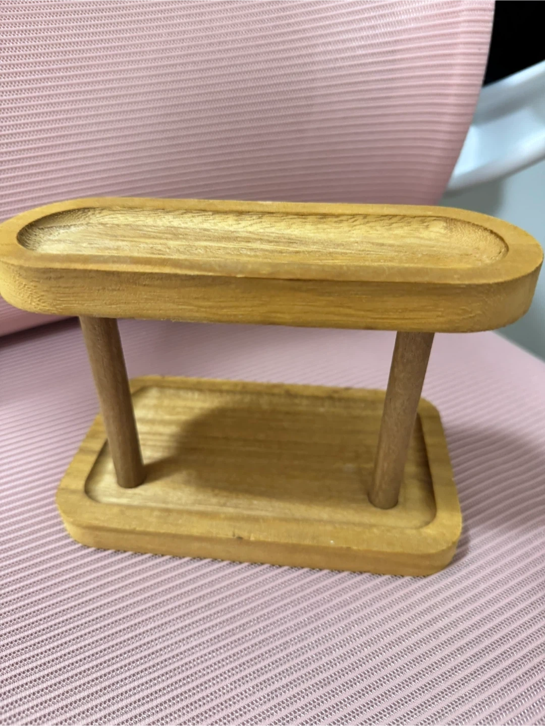 A small wooden shelf with a two-tiered design. It's made of natural wood and has a light, golden-brown finish. Perfect for displaying small trinkets or decorative items.