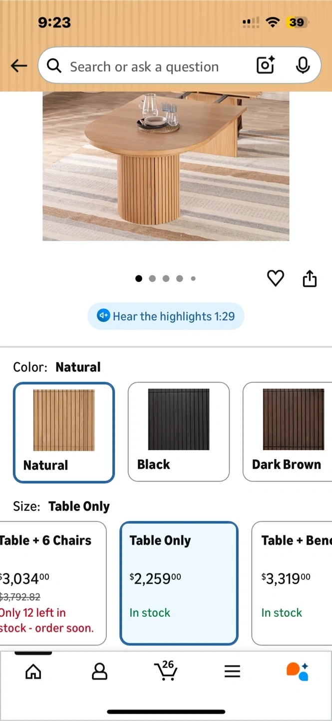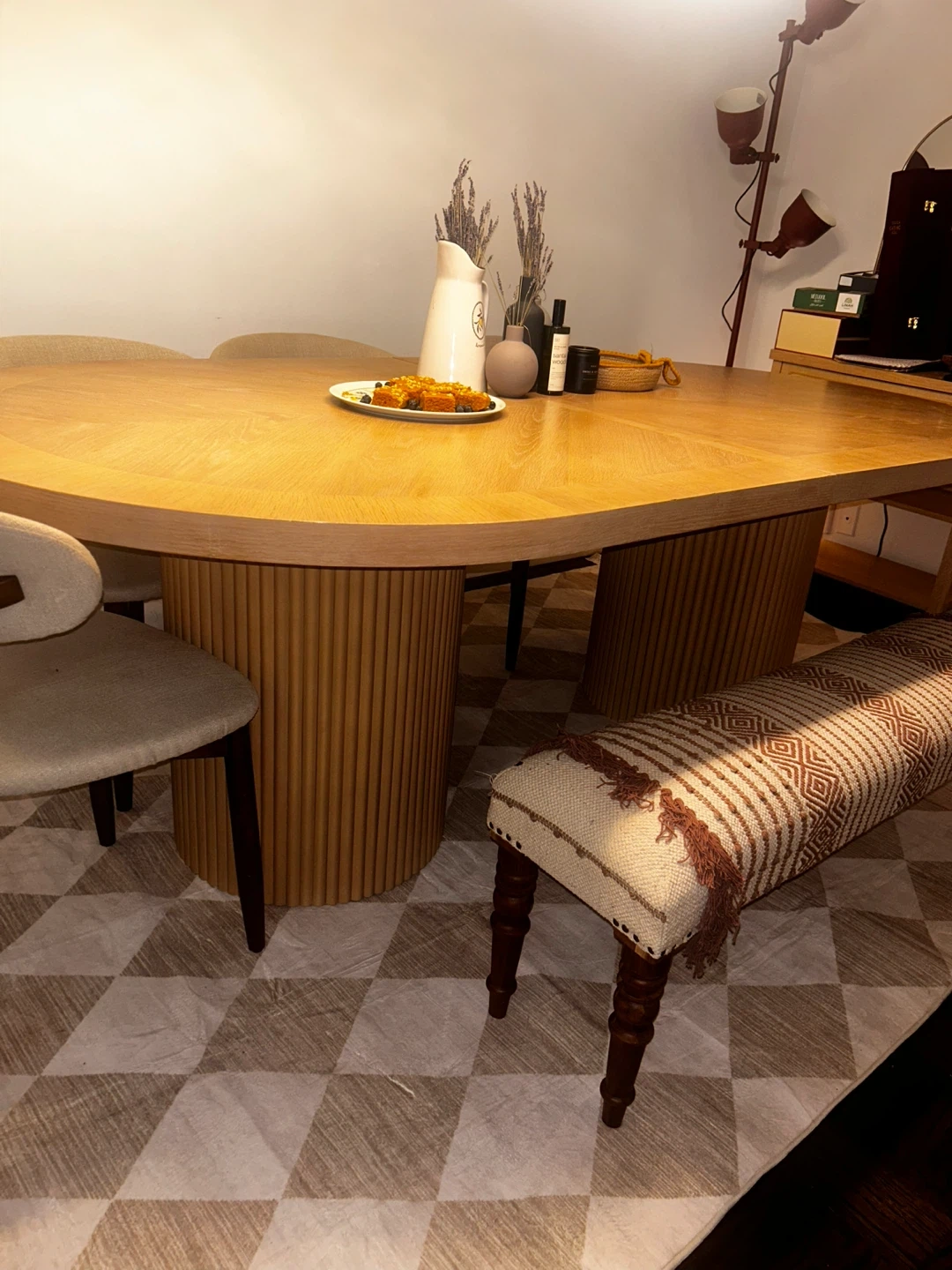 This oval dining table features a distinctive fluted pedestal base in a natural oak finish. Its unique design adds a modern touch to any dining space. Table only configuration.