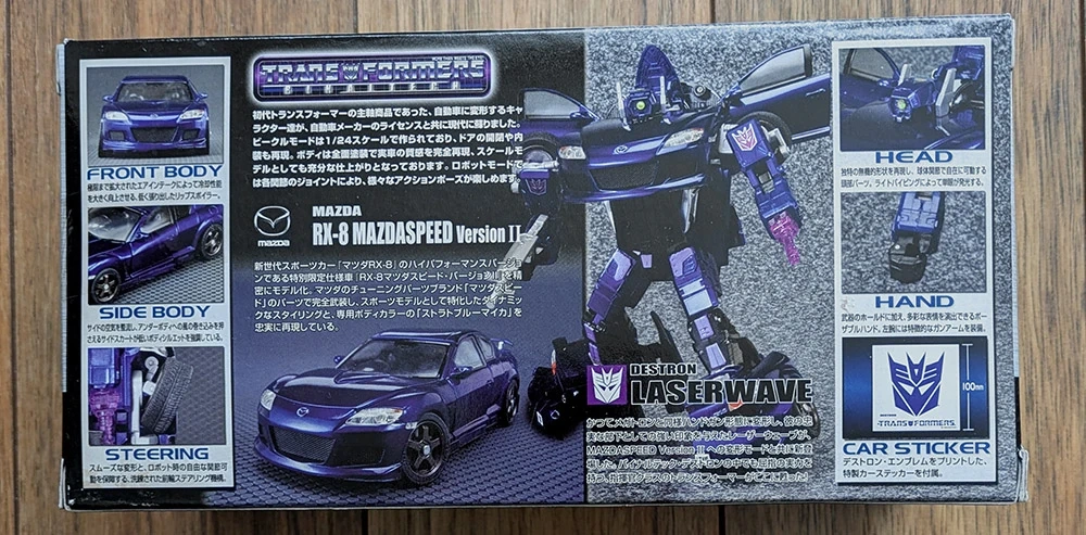 "Laserwave", BT-13, from the Transformers Binaltech line, brand new, factory sealed. Modelled after a dark purple Mazda RX-8 Mazdaspeed Version II in 1:24 scale.