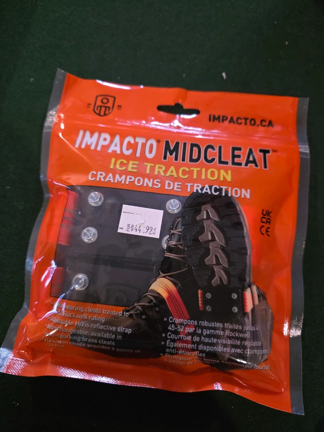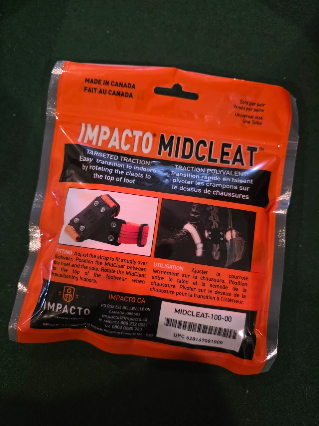 These Impacto Midcleats offer targeted traction for icy conditions. Easy transition to indoors by rotating the cleats. Made in Canada, they feature a universal size and adjustable strap.