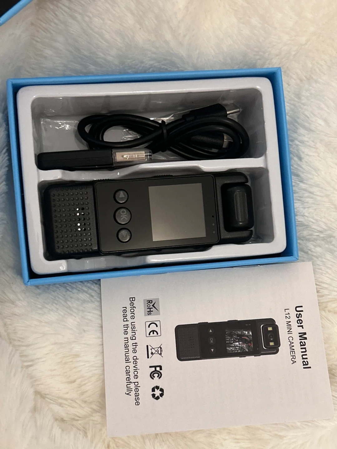 This is a 1080P mini body camera with 32GB of storage included. It's compact and comes with a USB charging cable. A user manual is also provided. It's useful for recording events or as a personal security device.