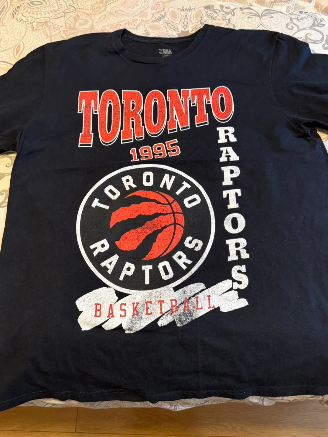 Black t-shirt celebrating the Toronto Raptors basketball team. Features the team name and "1995" graphic. It's in great condition. Barely worn. Size large in men.