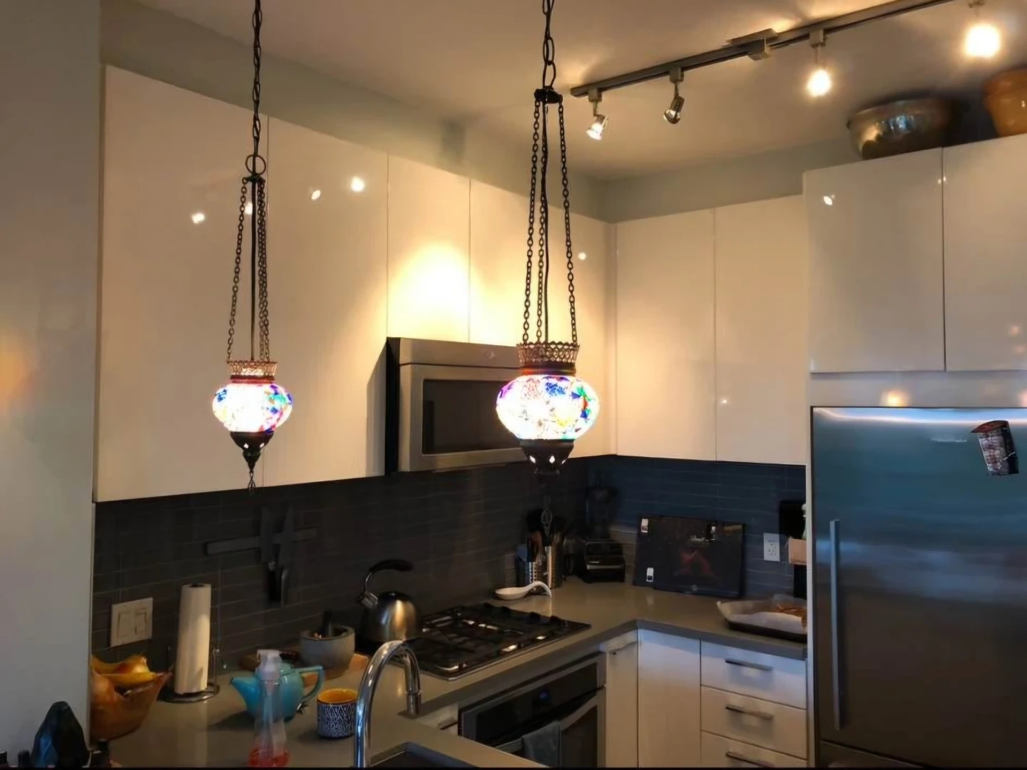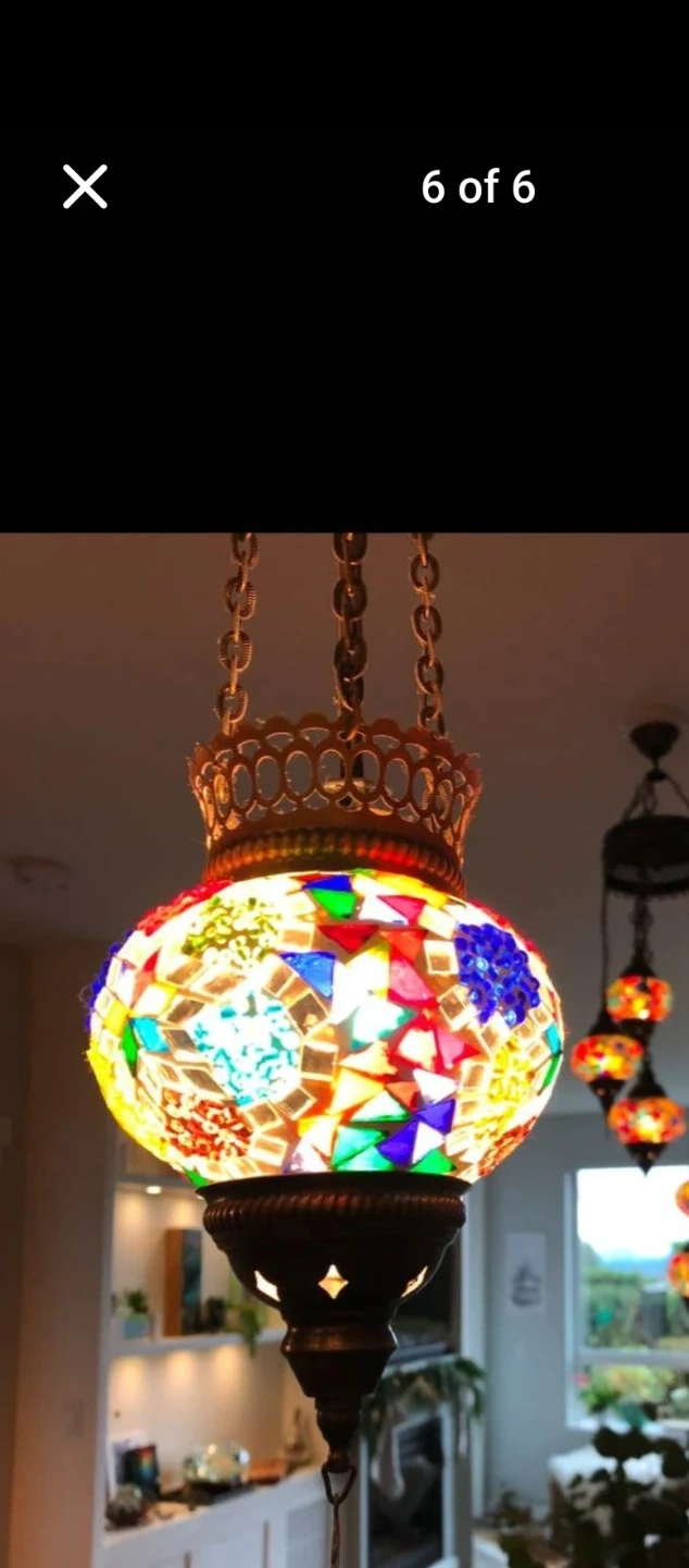 Beautiful mosaic glass hanging lamp with colourful glass pieces. It creates a warm and inviting ambiance when lit. This decorative light fixture adds a unique touch to any room.