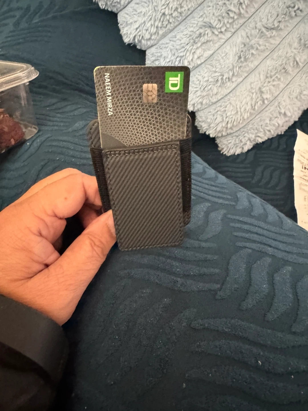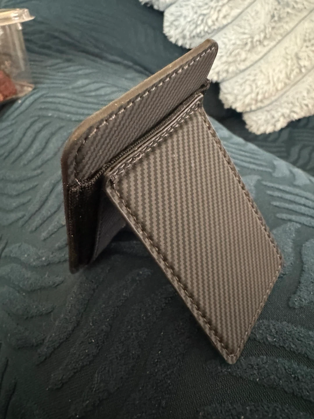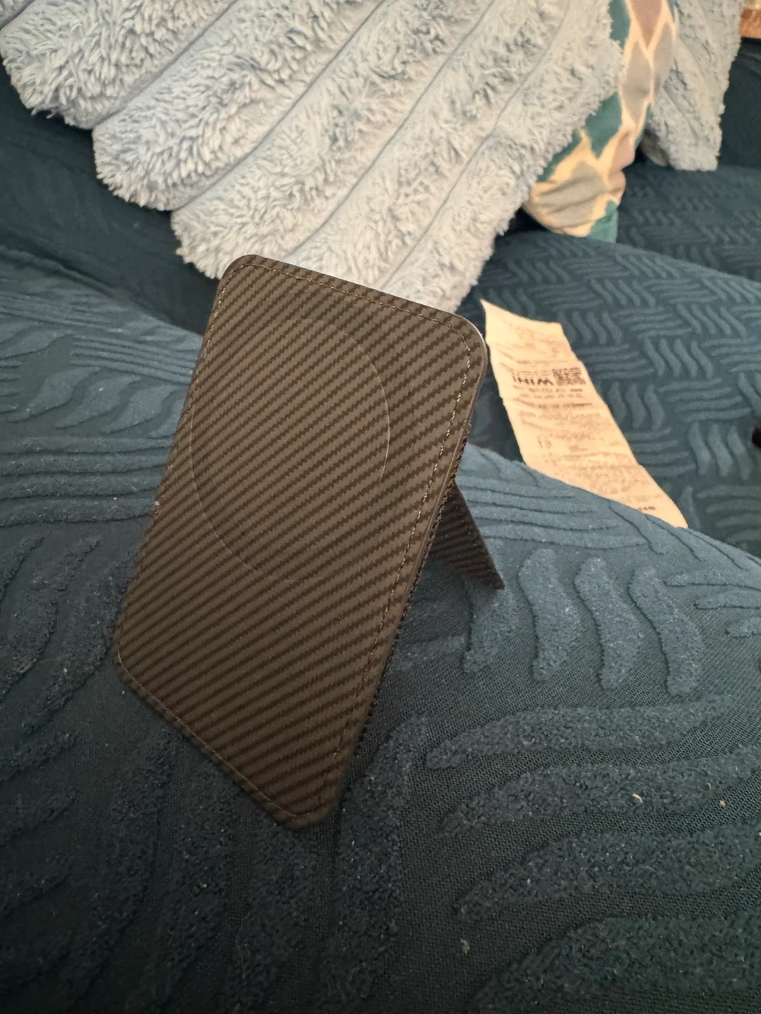 A sleek carbon fibre card holder with a stand function. It's designed to hold your essential cards securely. Folds flat for easy storage.