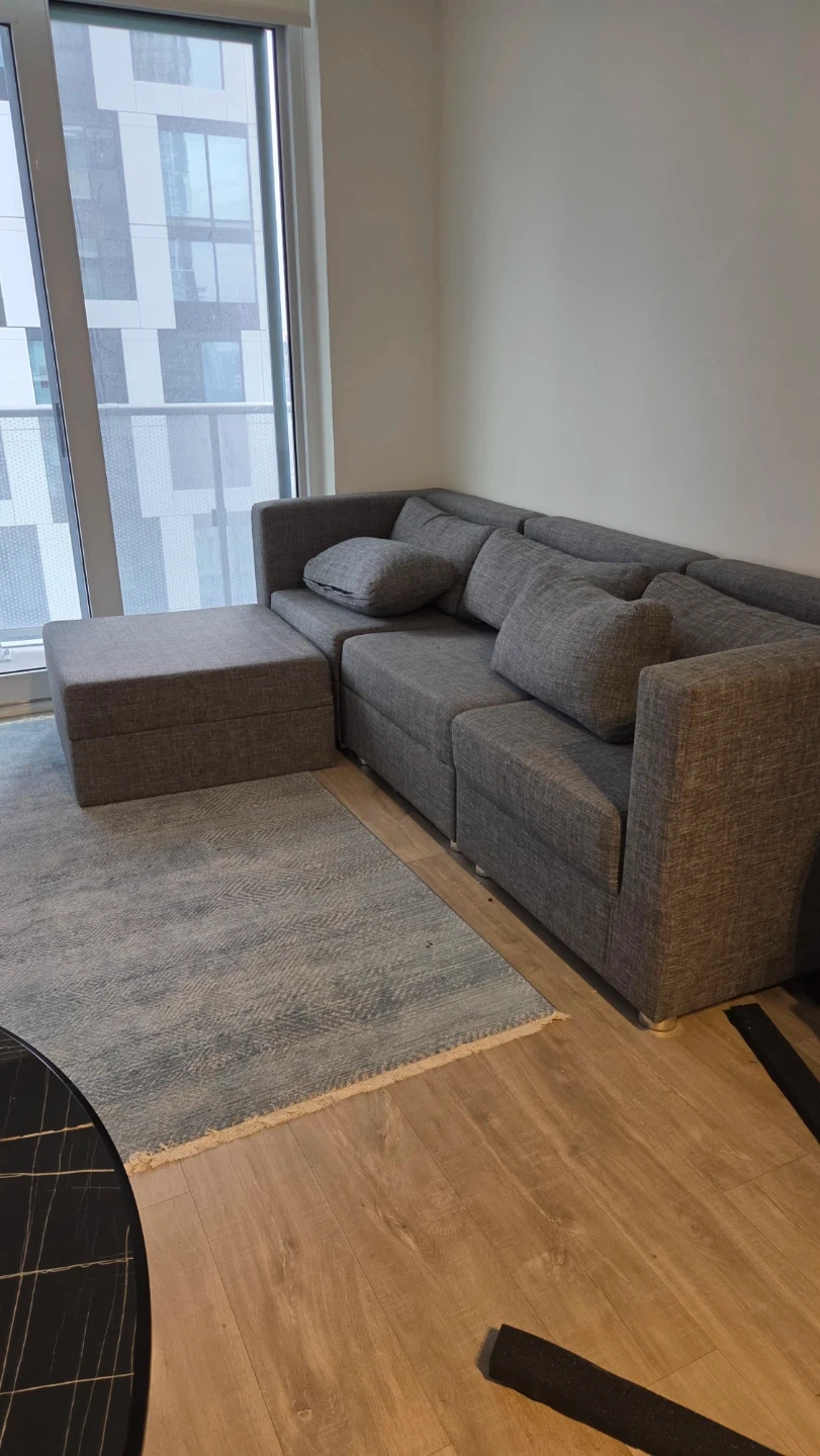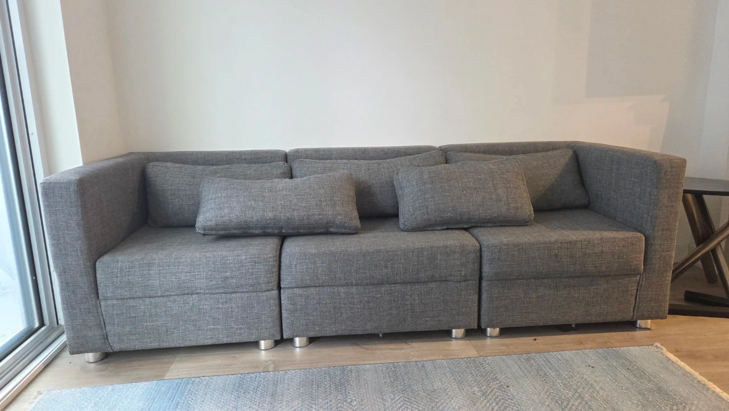 Modular grey sectional sofa with multiple configurations. Includes a matching ottoman that can be used for extra seating or as a footrest. Upholstered in a durable, textured fabric. It's a great piece for any living space!
