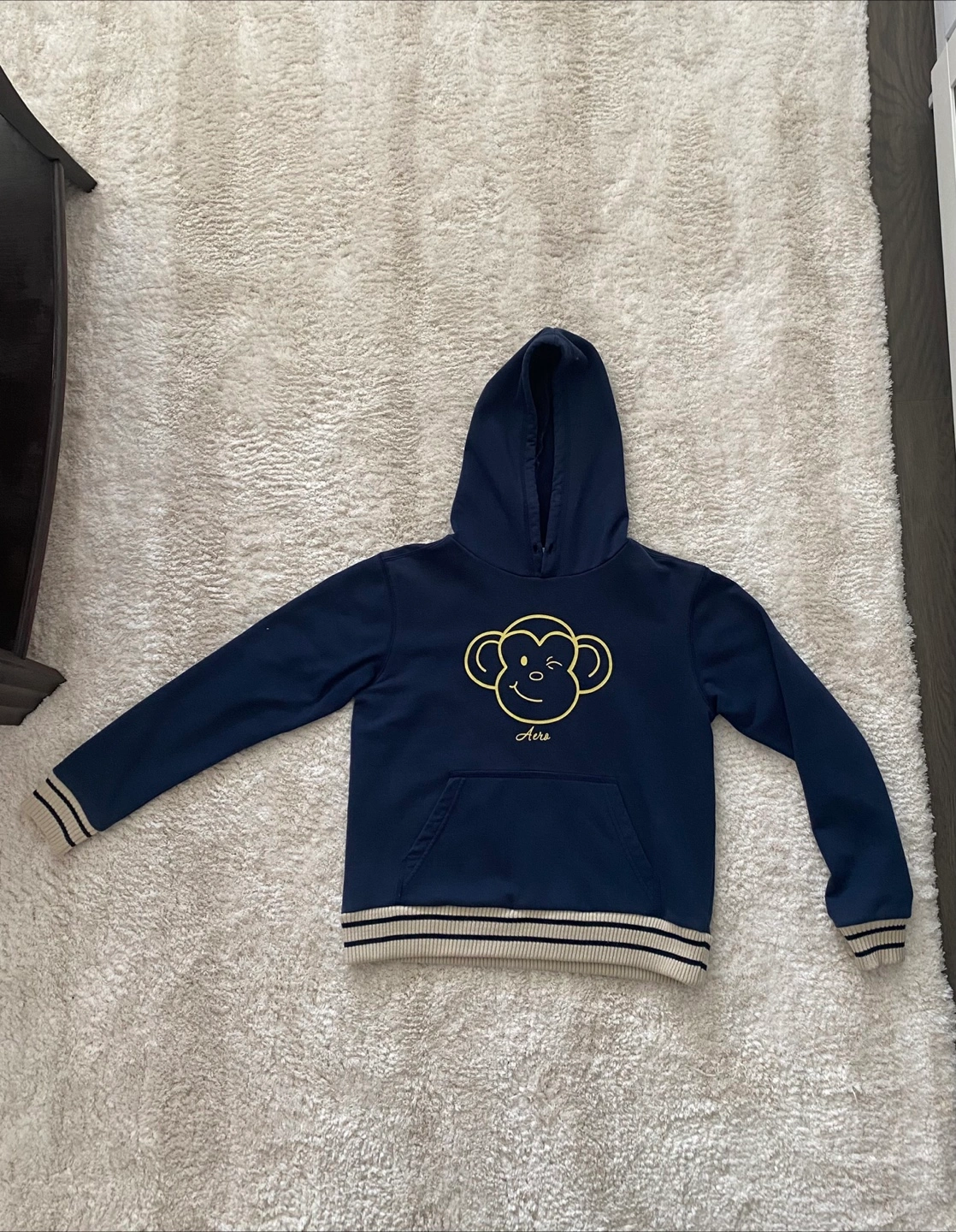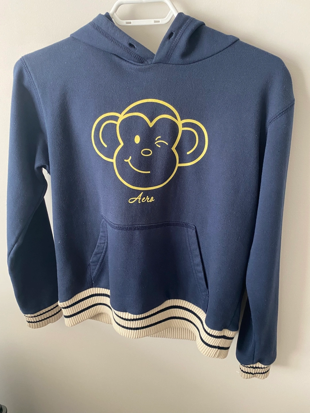 A navy blue Aeropostale hoodie with a cute monkey design! It's in great condition and ready for a new home. Perfect for keeping cozy on cooler days