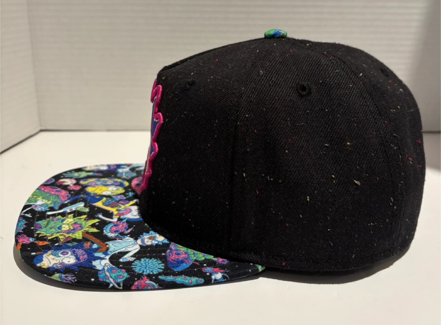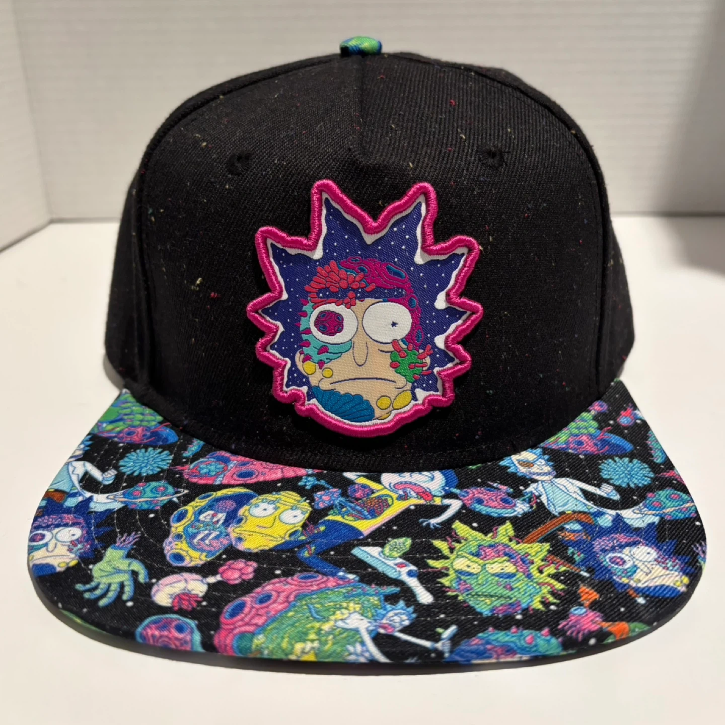 This is a black snapback hat featuring a colorful Rick and Morty graphic print on the brim and a Rick patch on the front. It's designed for one size fits most with an adjustable snap closure. The hat has a speckled black fabric with multi-coloured flecks throughout.