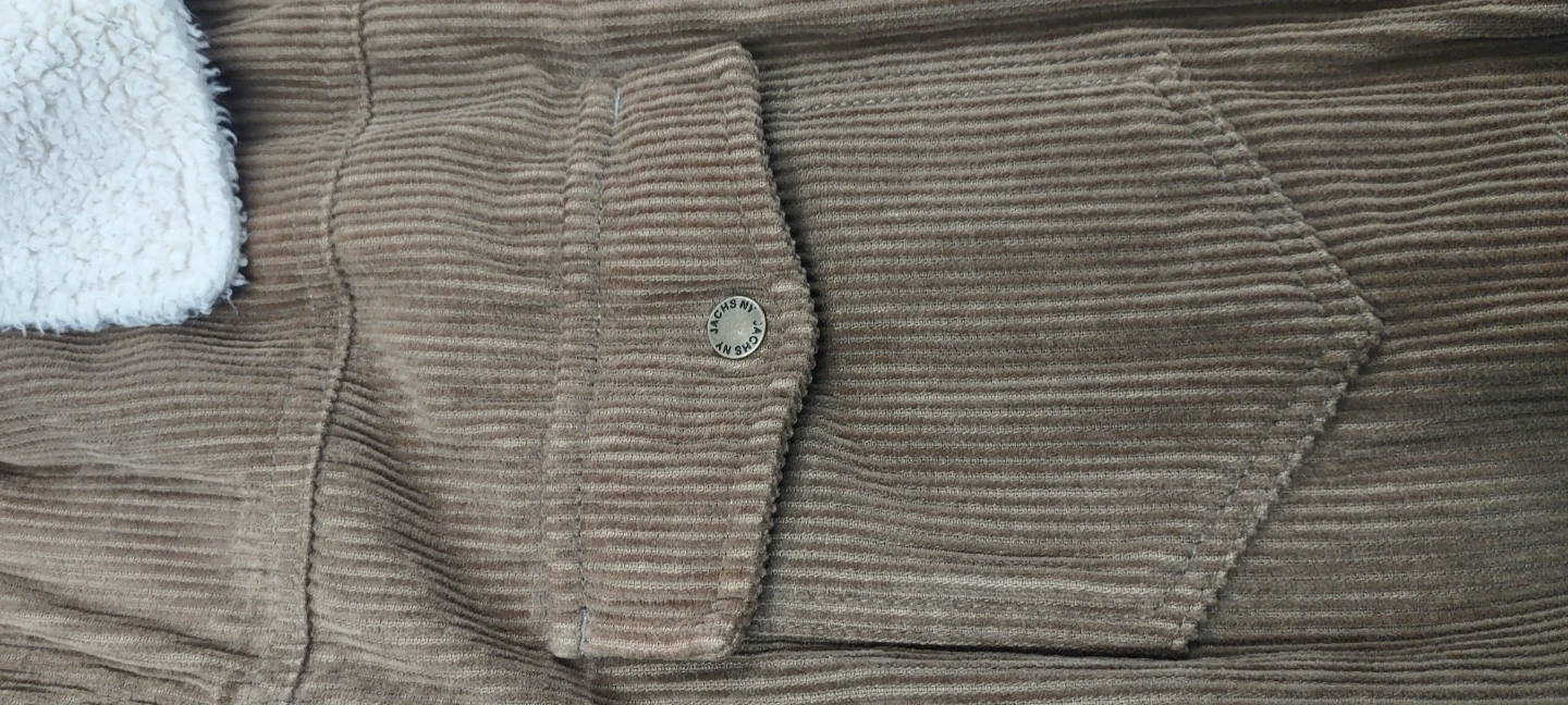 Brown corduroy jacket with a cozy sherpa lining and collar. It features two chest pockets and button closures. Made in Bangladesh.