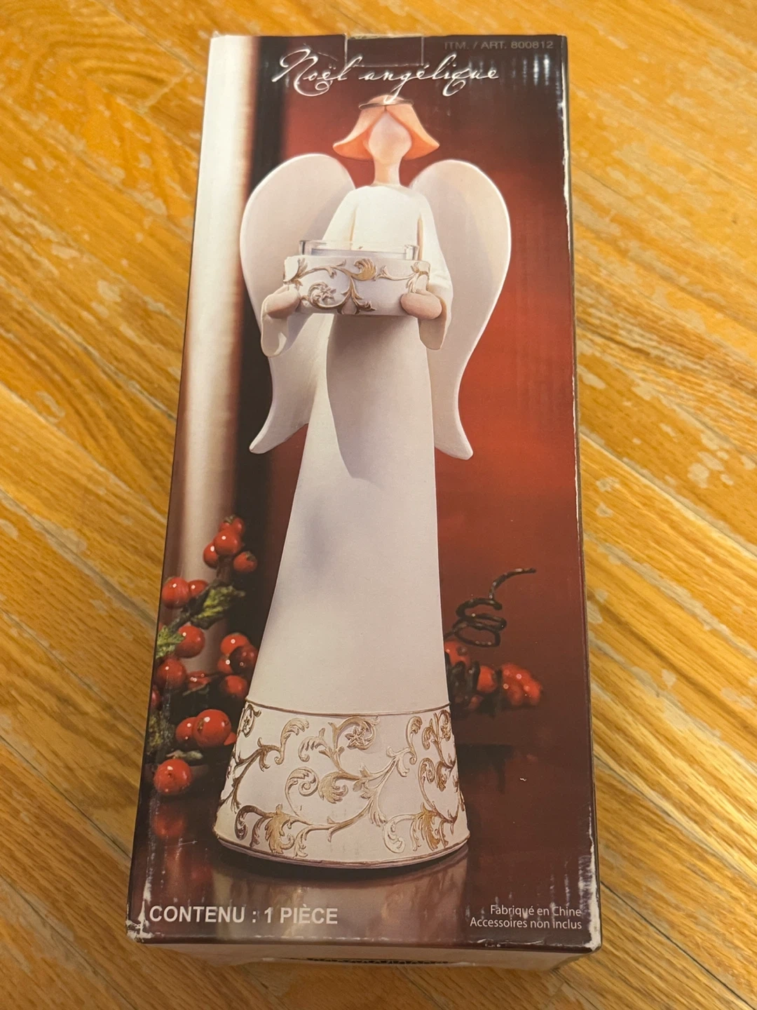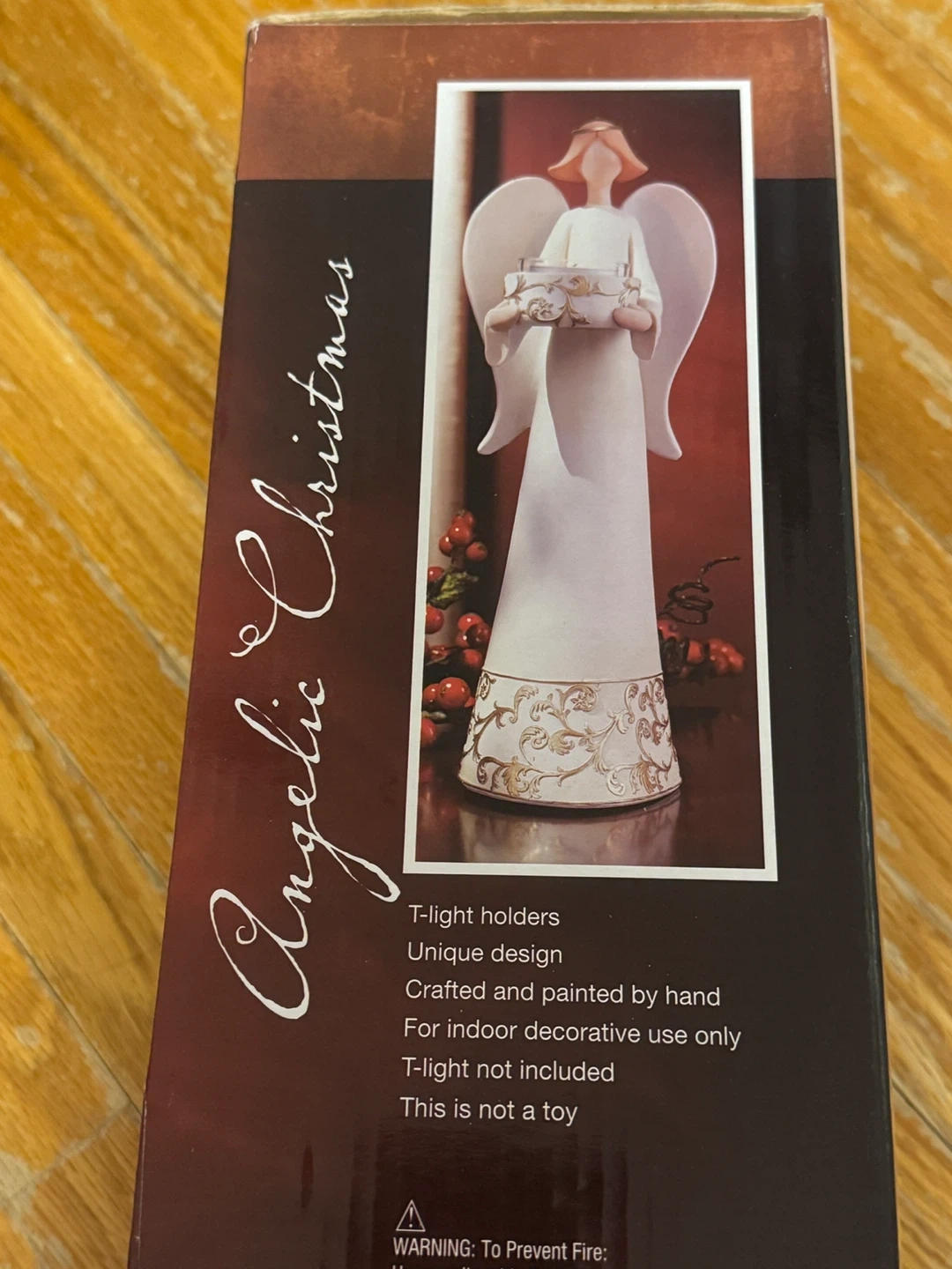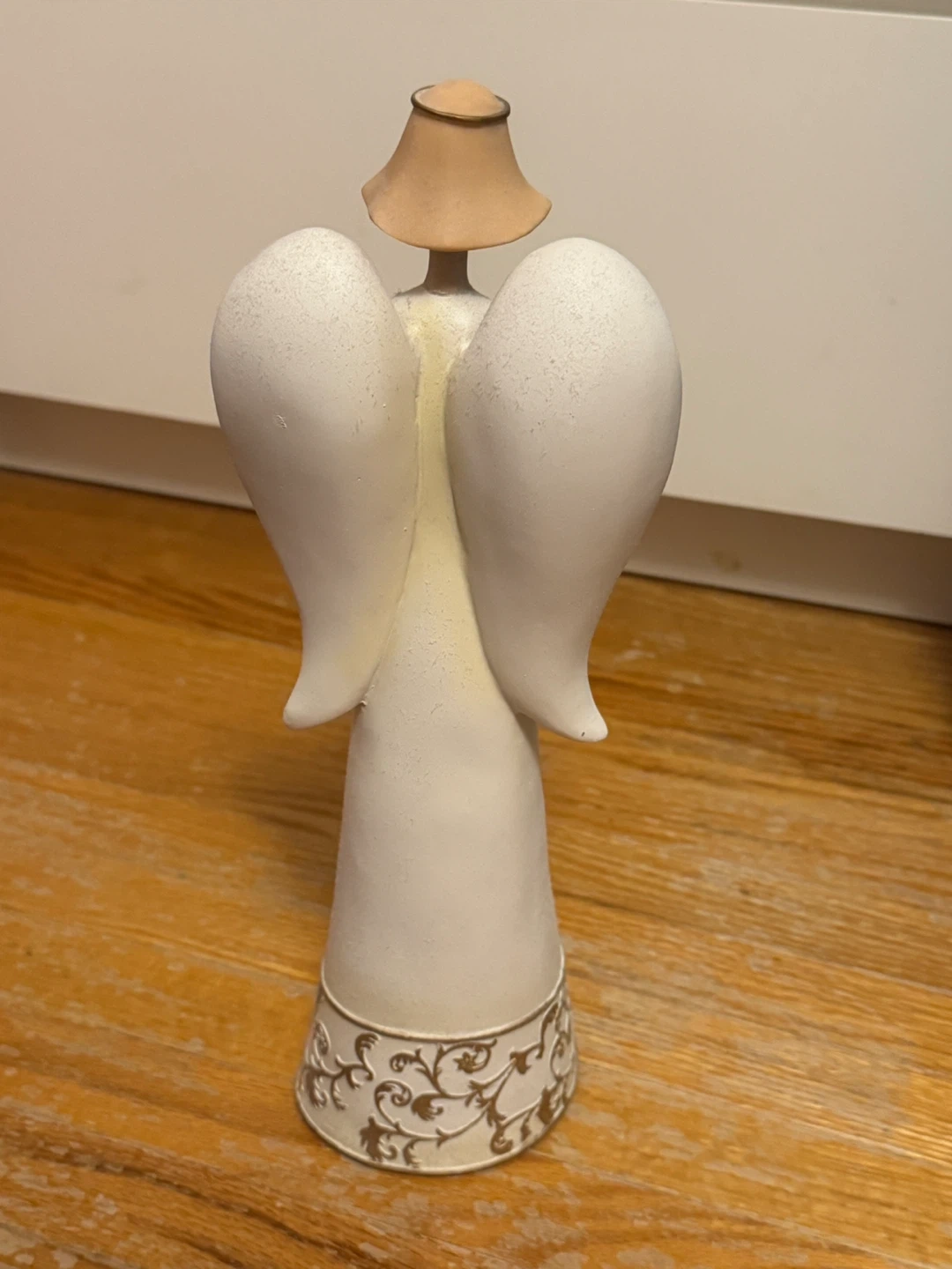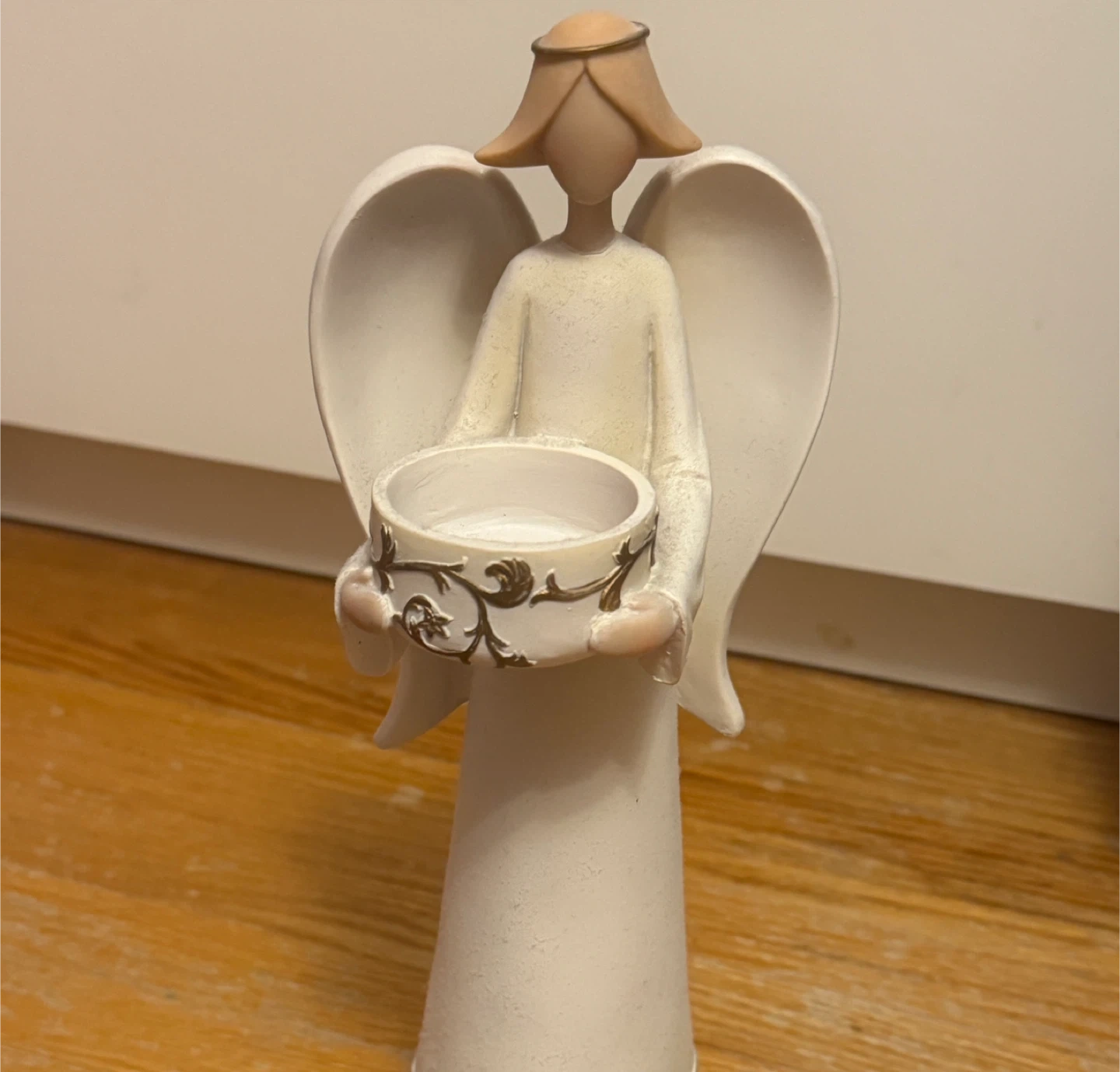 This angel figurine holds a T-light candle holder. It's designed with intricate gold scrollwork on the base and the holder. Crafted and painted by hand for indoor decorative use. T-light not included.