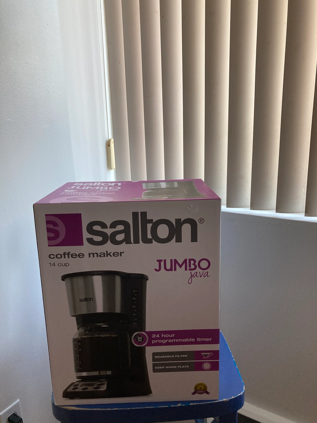 selling a brand new Salton coffee maker! It's a 14-cup model with a 24-hour programmable timer. It also has a reusable filter and a keep-warm plate. The box is included