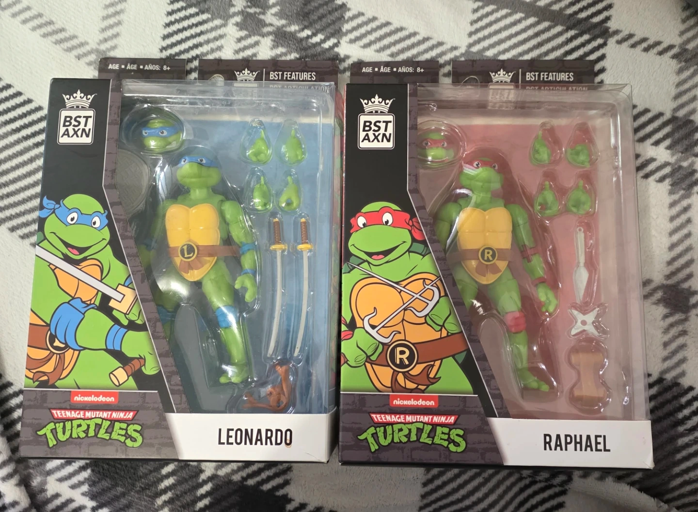 These are BST AXN Teenage Mutant Ninja Turtles action figures featuring Leonardo and Raphael. Each figure comes with accessories and is recommended for ages 8+.