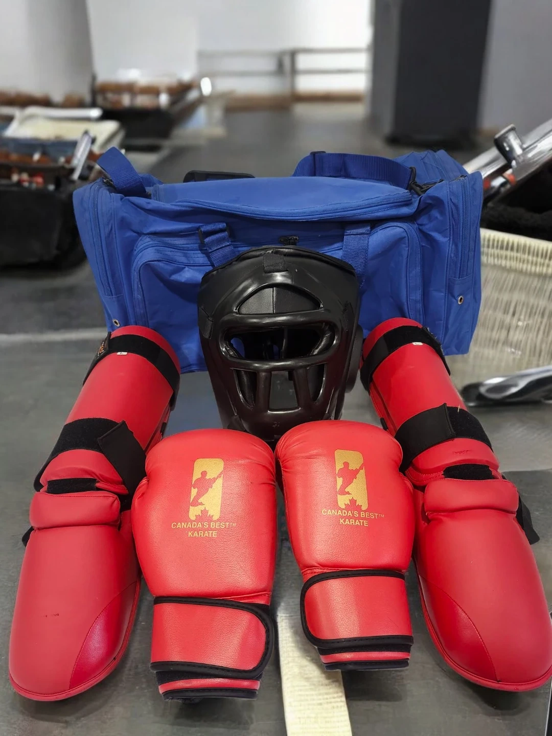 Karate sparring gear set, including a blue gear bag, red gloves, red shin/foot pads, and a black face-mask head guard.