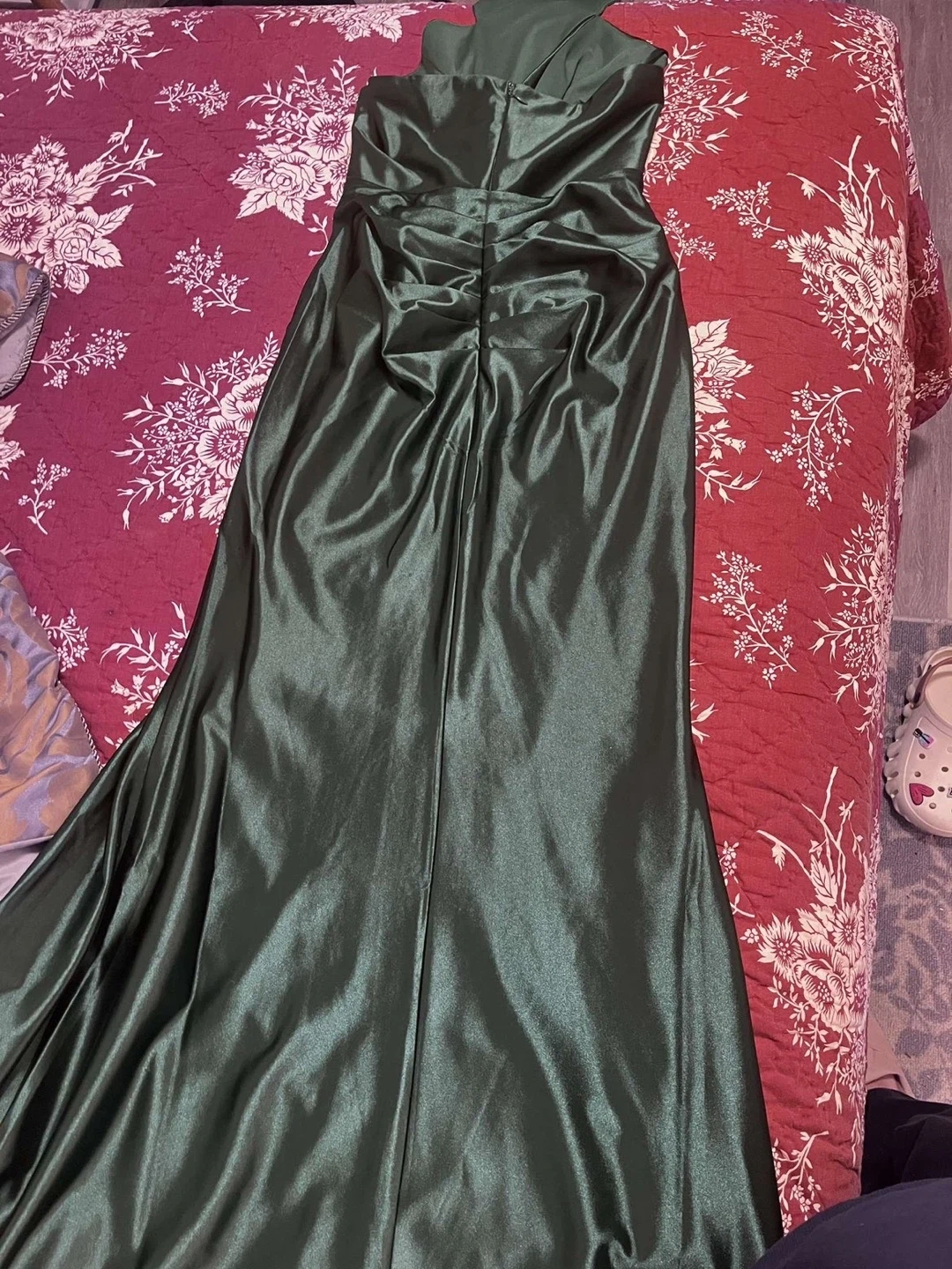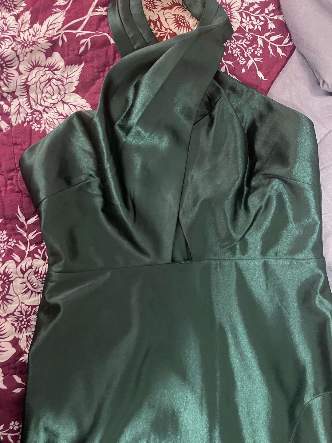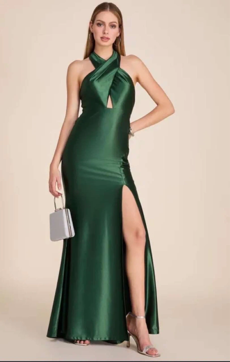 This elegant green gown features a flattering halter neck and a stylish thigh-high slit. It's made from a smooth, shimmering satin material. Perfect for a formal event or wedding guest attire!
