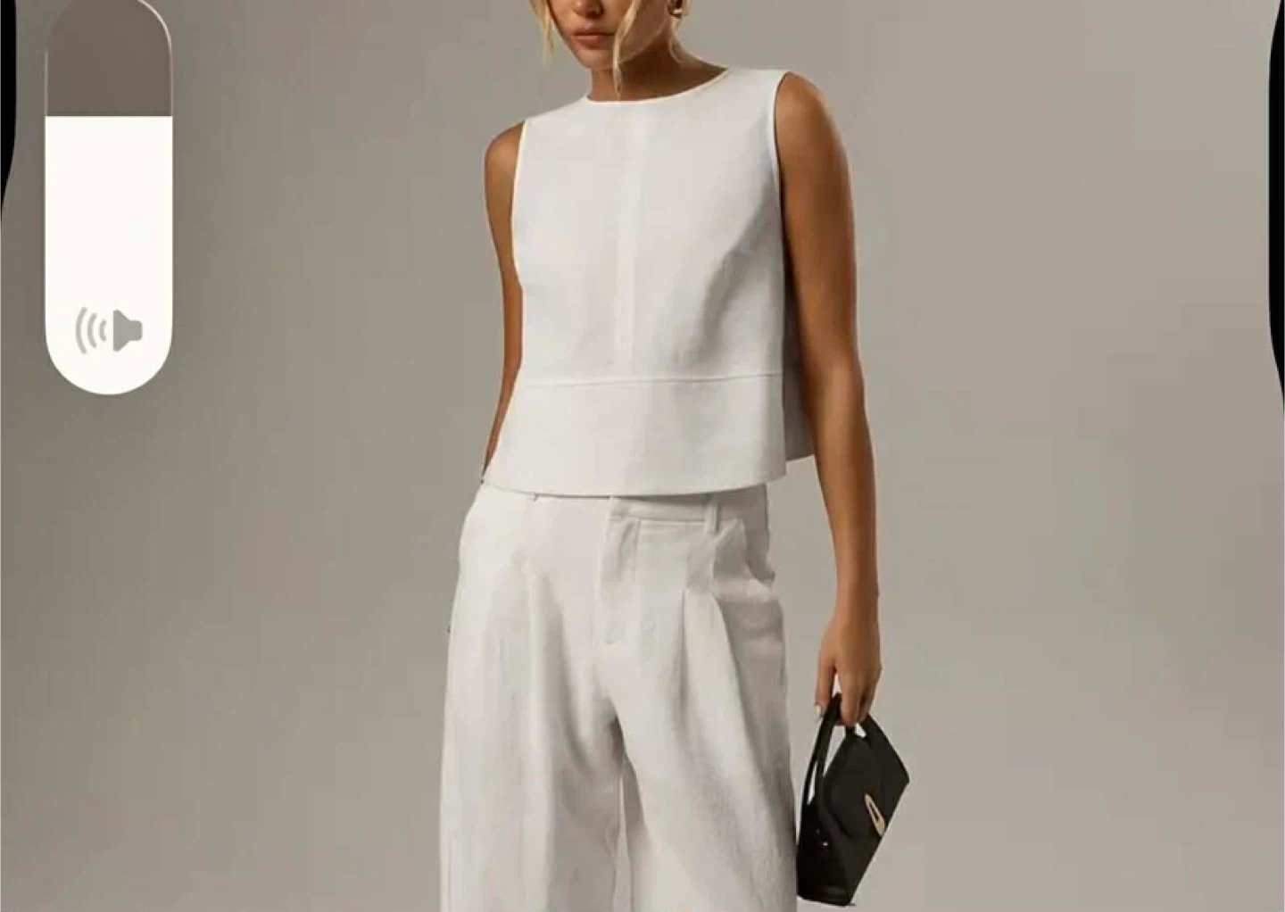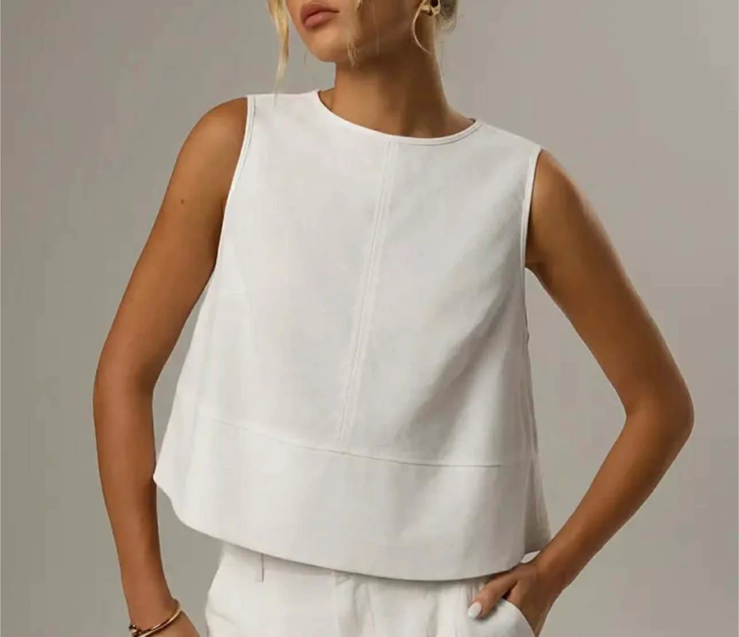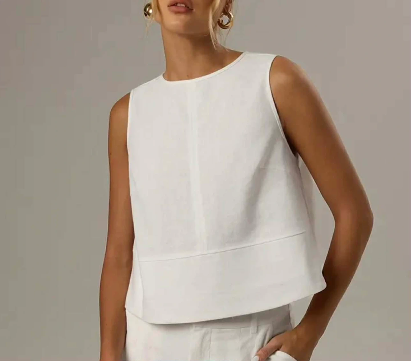 A chic white sleeveless cropped top. It features a round neckline and a slightly flared hem. The material appears to be a linen blend.