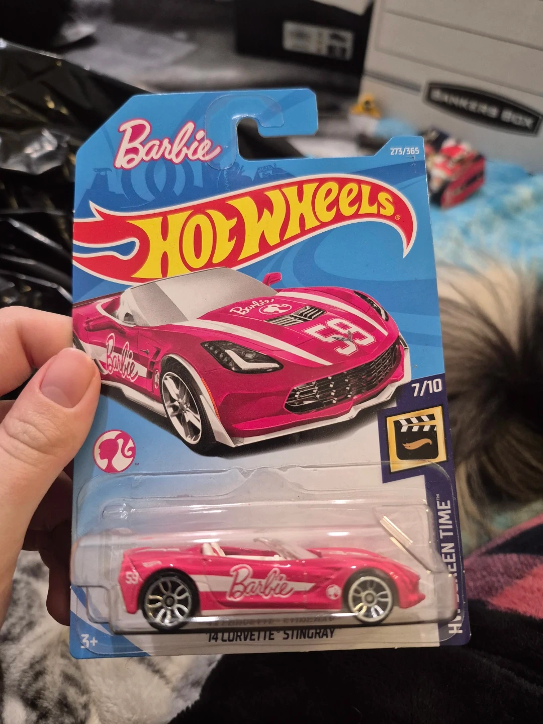 Hot Wheels Barbie 14 Corvette Stingray. It's a die-cast car with Barbie branding. Recommended for ages 3 and up. This car is part of the 7/10 series.
