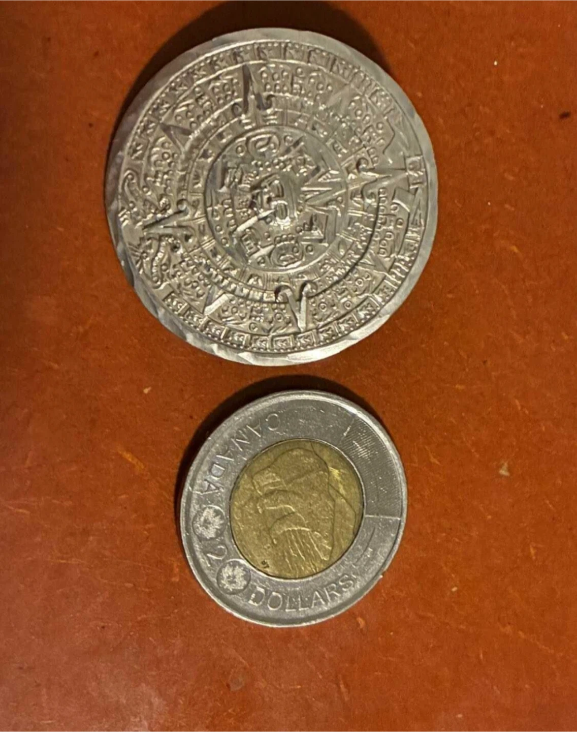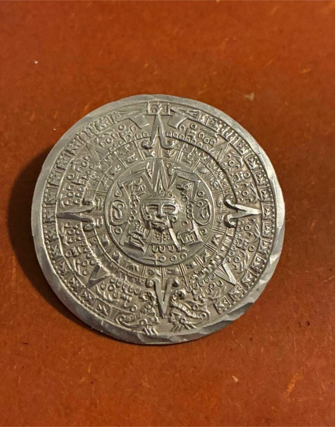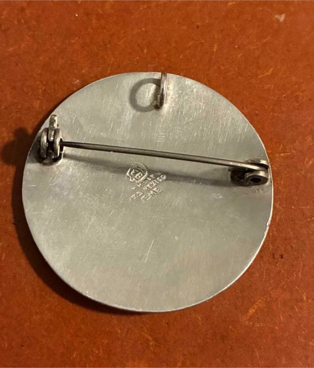 This is a sterling silver brooch/pendant featuring an Aztec calendar design. The back has a standard pin closure. Made in Mexico.
