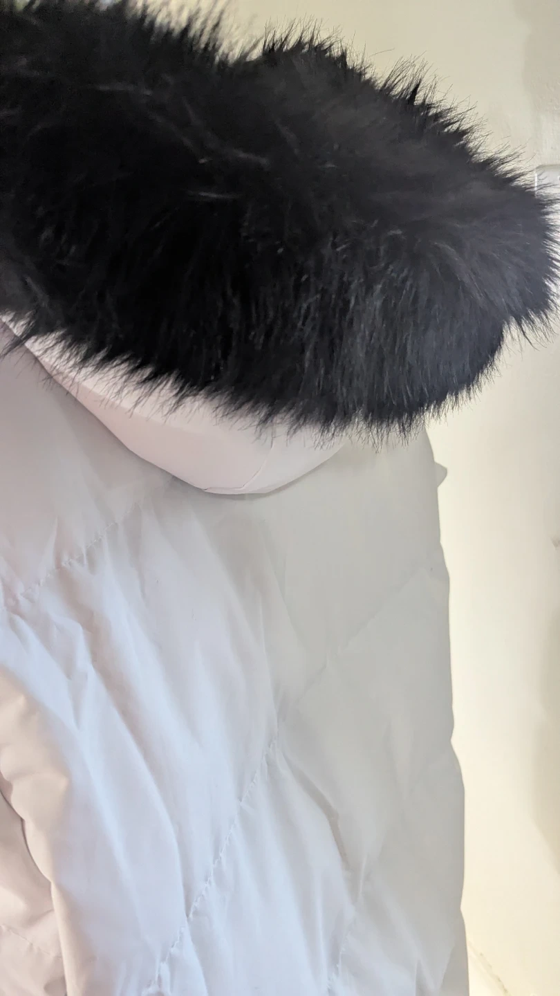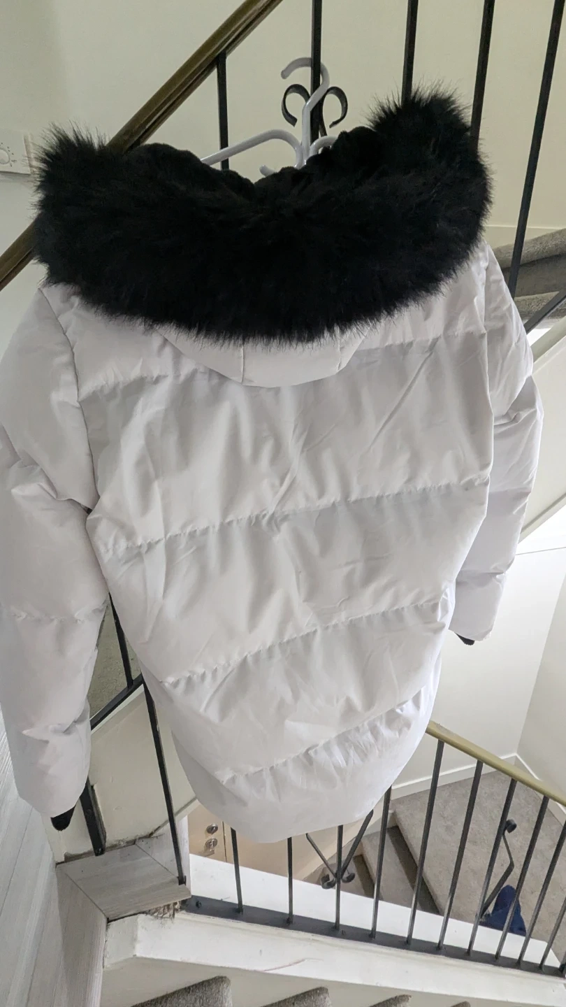 This Canada Weather Gear puffer jacket is white and features a black faux fur-lined hood. It's designed for winter warmth with a temperature rating down to -30°C. The jacket has a comfortable fleece-lined interior. It's a great choice for staying warm in cold weather! Over 499 in store it's just tight on me I use it only once very very clean