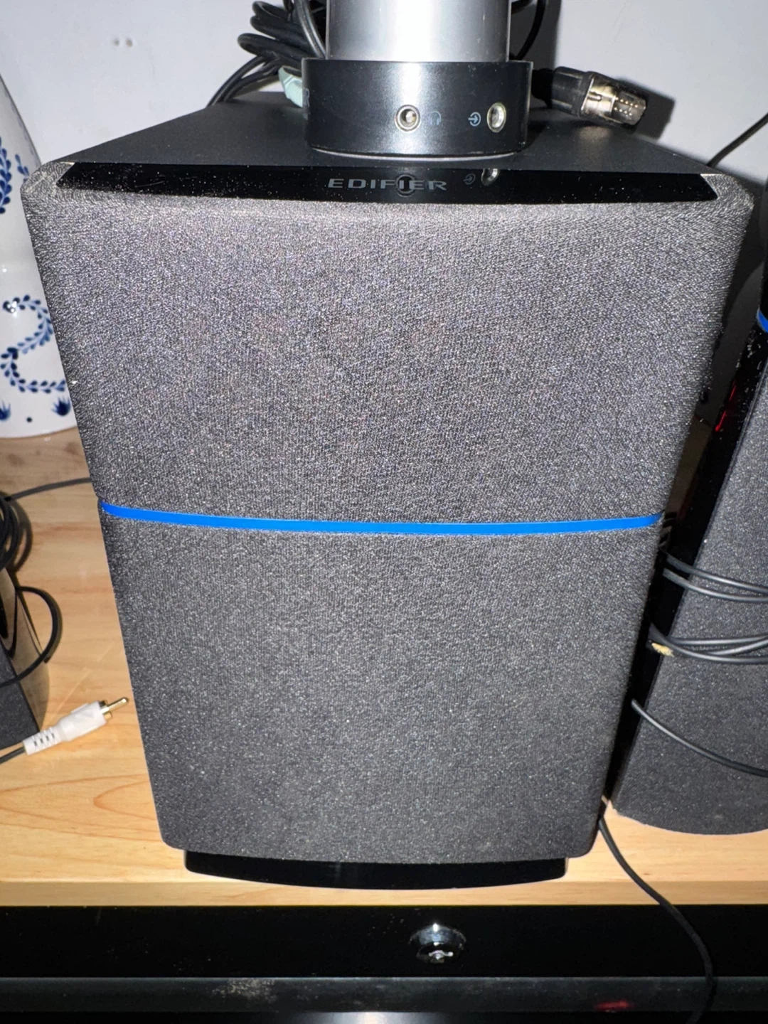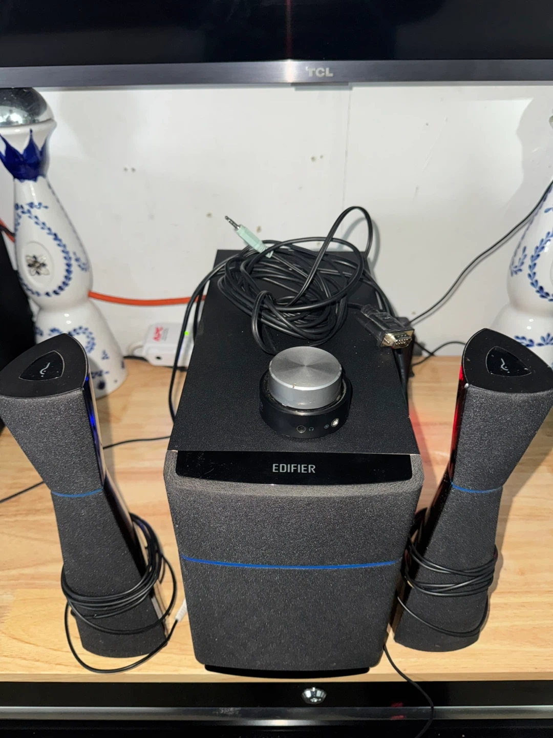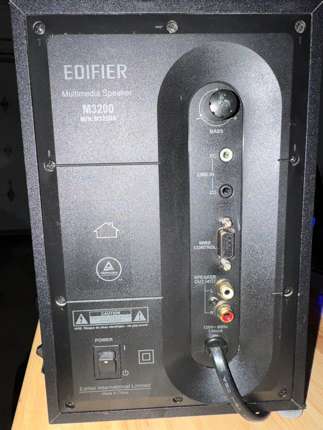 Great sounding Edifier M3200 Multimedia Speaker. Has a subwoofer and 2 satellite speakers with volume control on the subwoofer. Includes power and audio cables. Back panel has various input options including RCA, 3.5mm, and a 9-pin connector. Bass is adjustable.