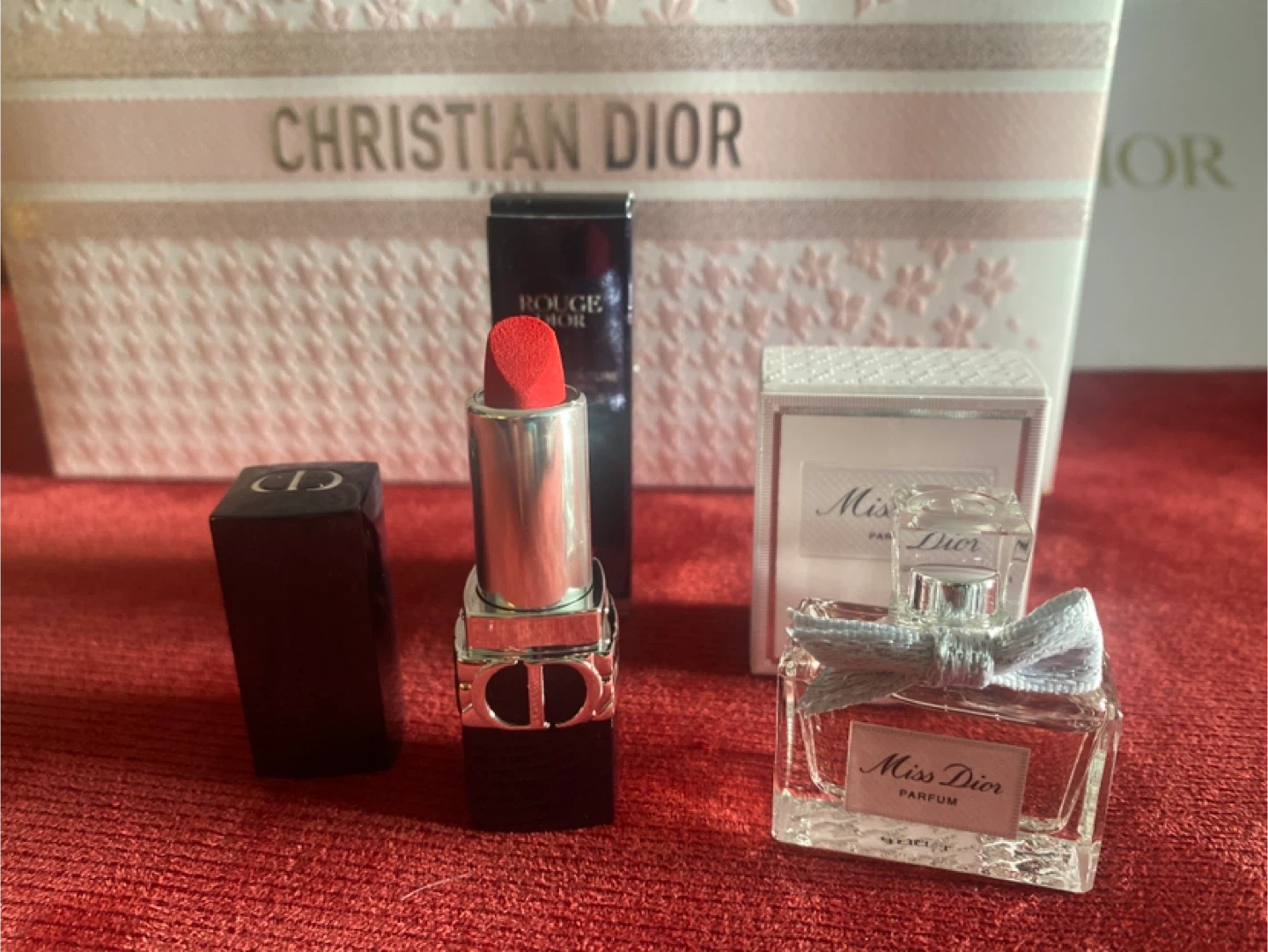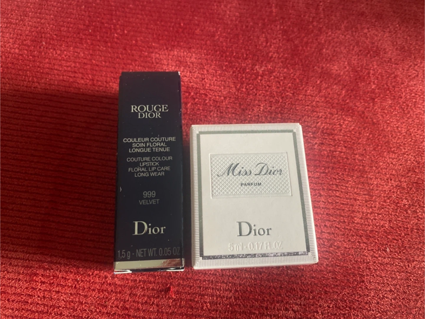 This is a Dior gift set featuring a Rouge Dior lipstick in shade 999 Velvet 1.5g and a 5ml bottle of Miss Dior perfume. (Minis)