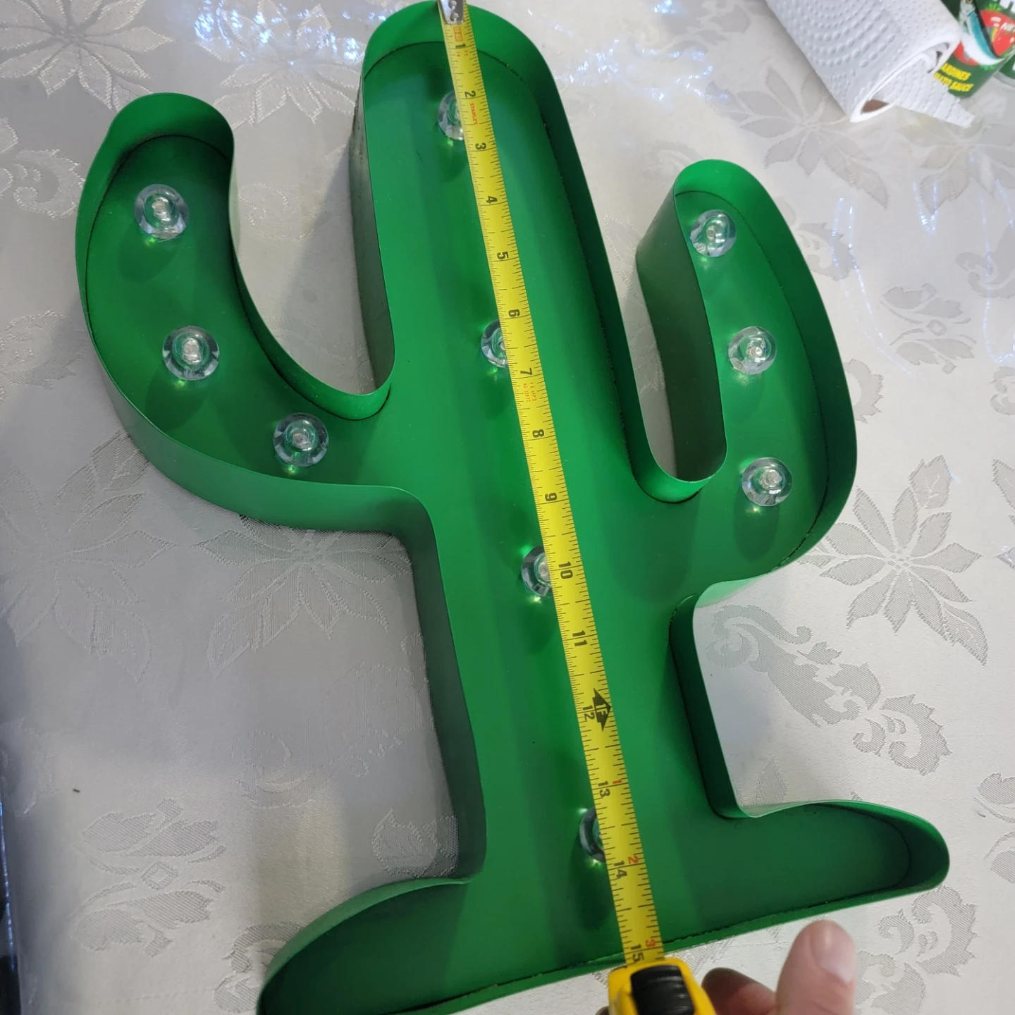 This is a green metal cactus marquee light. It's about 14 inches tall and includes 8 LED bulbs. It's a fun decorative piece for a room!