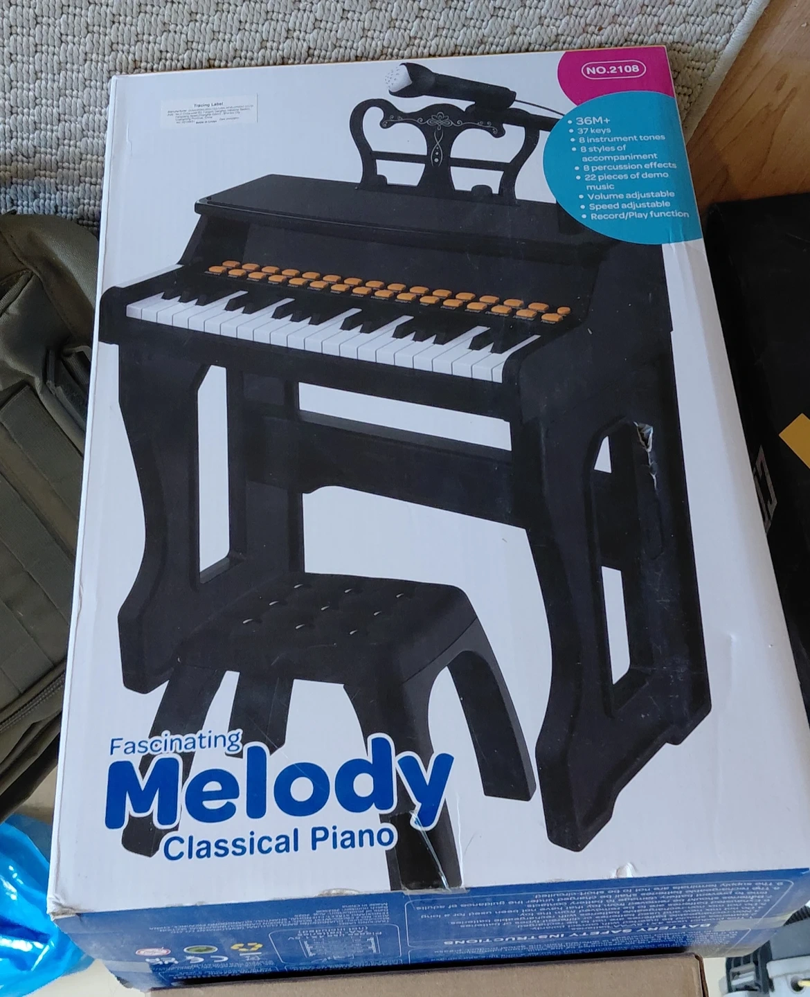 This Fascinating Melody Classical Piano has 37 keys and 36M+ age recommendation. It features 8 instrument tones, 8 styles of accompaniment, 8 percussion effects, and 22 demo songs. Volume and speed are adjustable, and it has a Record/Play function. A microphone is included!