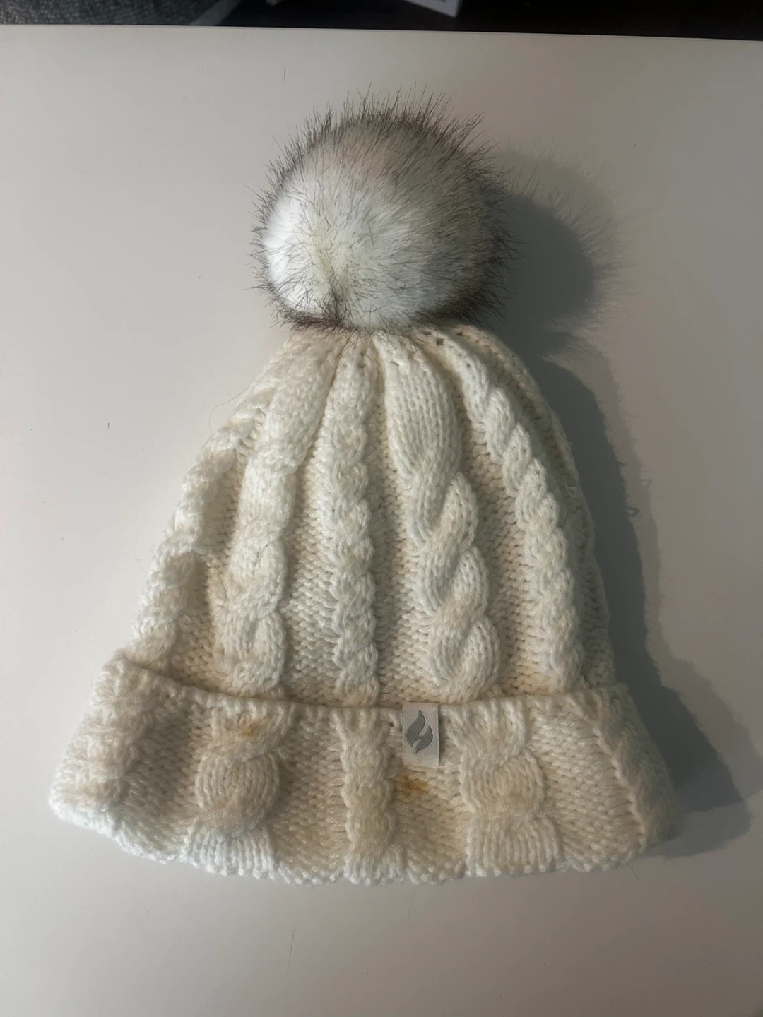 A cozy white cable knit toque with a faux fur pom pom. It's made from a soft, warm material perfect for chilly weather. This hat features a classic cuffed brim design.