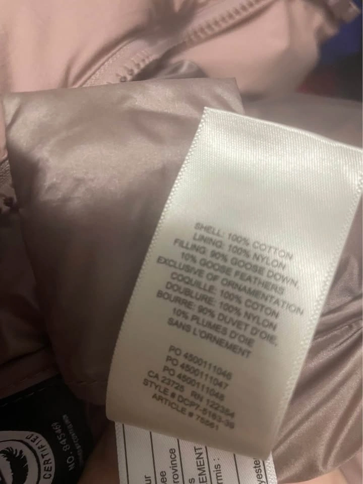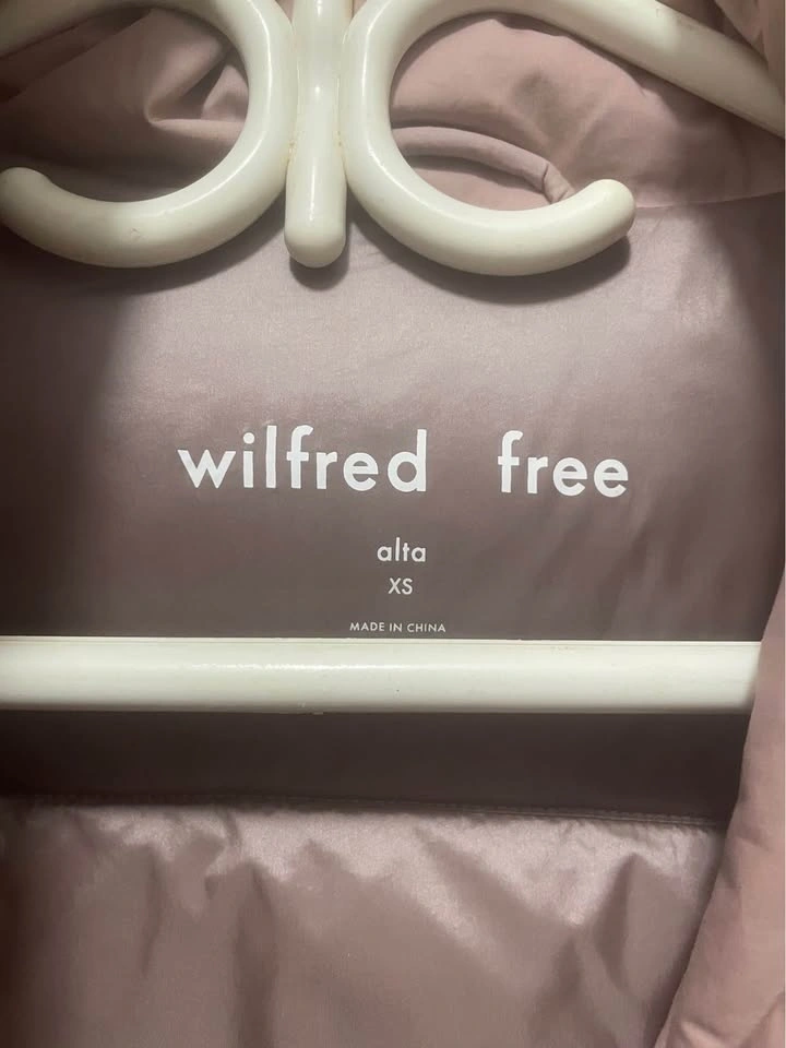 Stylish Wilfred Free Alta puffer jacket. Size XS in a pretty pink/blush color. Has a cozy large collar and a tie belt for a cinched look. Shell is 100% cotton, lining is 100% nylon. Filling has 90% goose down and 10% goose feathers. Super warm for chilly days.
