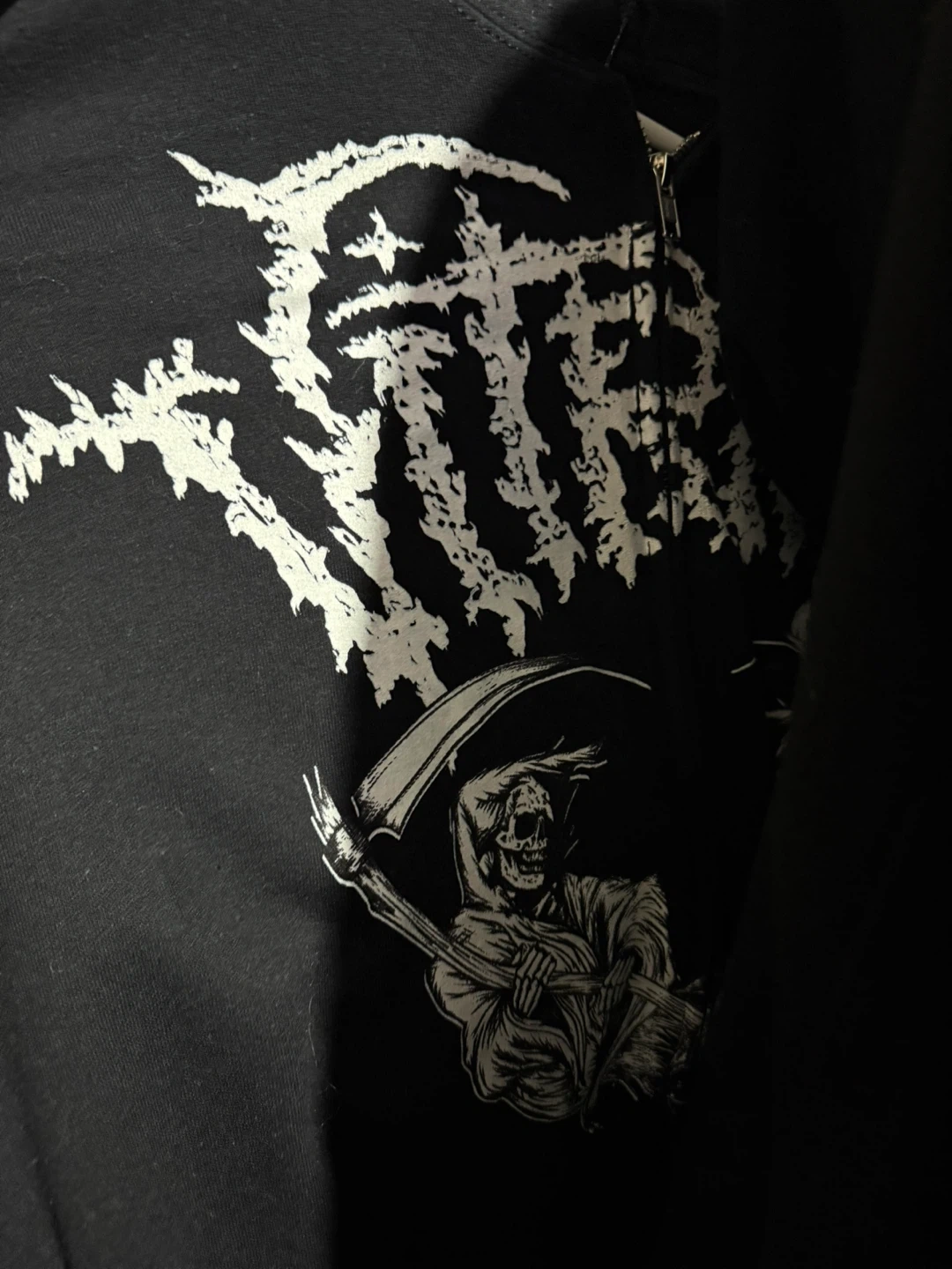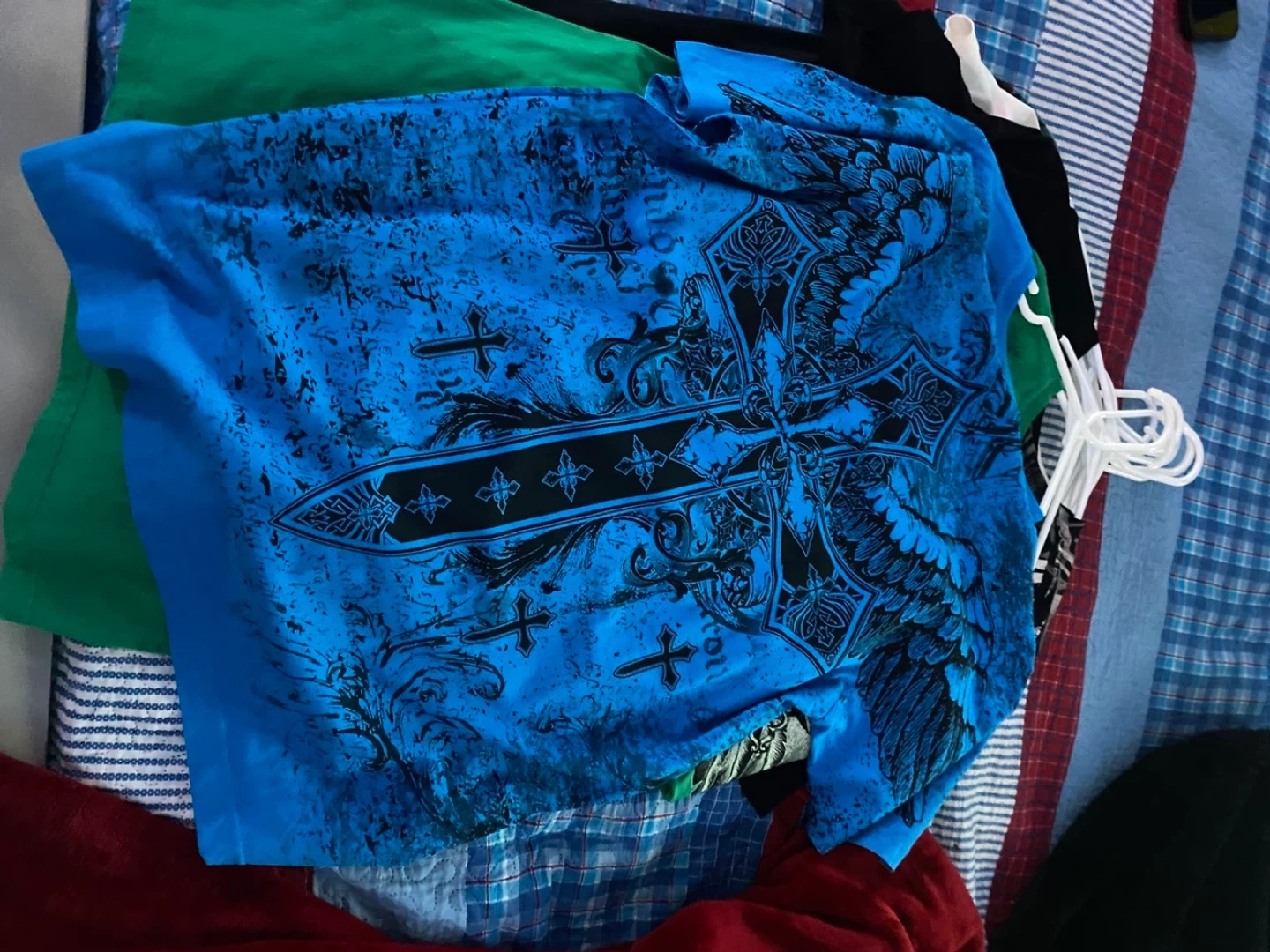 A collection of graphic tees featuring brands like Affliction and Gallery Dept. Designs include skulls, grim reapers, and other edgy graphics. Perfect for adding some unique style to your wardrobe