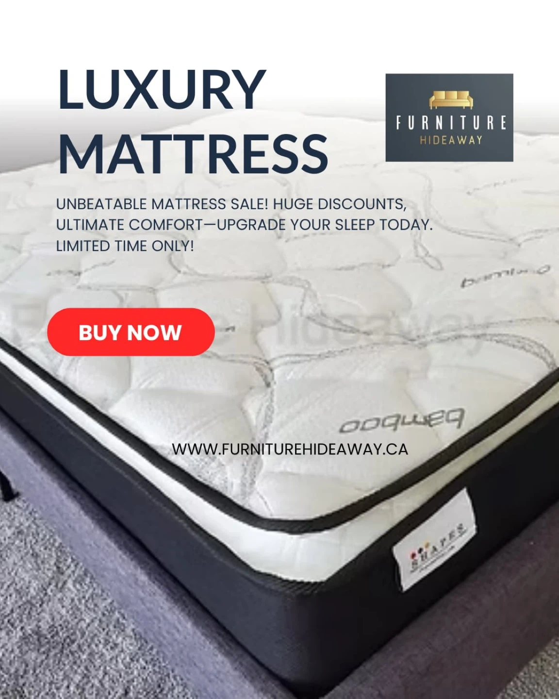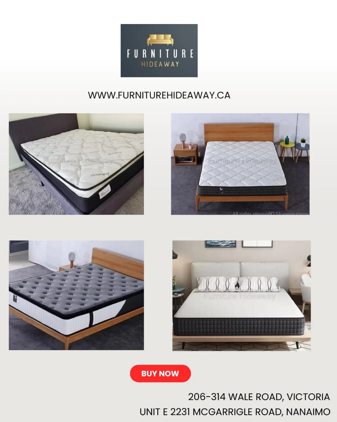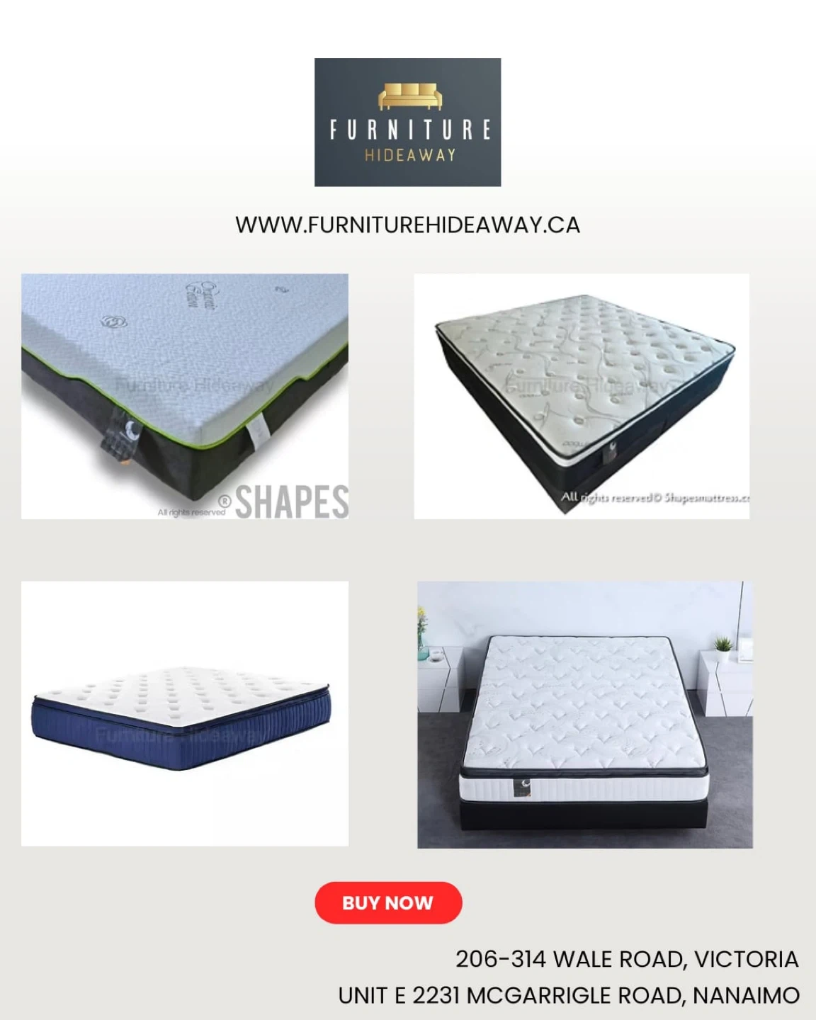 20Invest in your well-being with a new mattress at a great price. Limited Time Offer Only! Single starts at $199 Double starts at $249 Queen starts at $279 King starts at $579 Feel free to visit our showroom: 📍Victoria: Unit 206-314 Wale Rd Colwood Phone: 250-858-5164 Open daily: Mon-Friday: 11am-7pm Weekends: 10am-6pm Holidays ** 11am-5pm** 📍Nanaimo: Unit E -2231 Mcgarrigle Rd, Nanaimo Phone : 778-700-8382 Monday- CLOSED Tuesday to Sunday: 10am-6pm www.furniturehideaway.ca